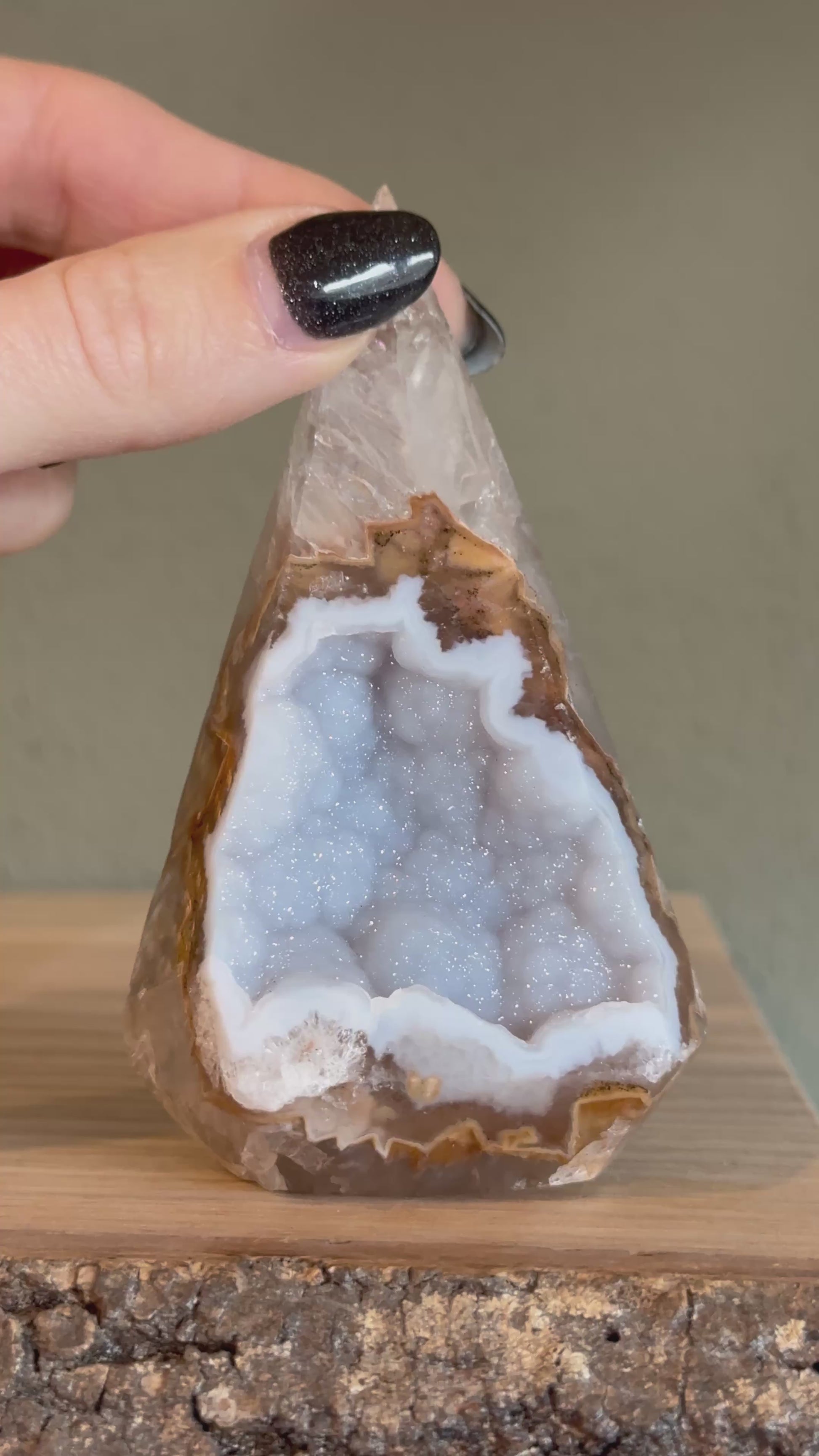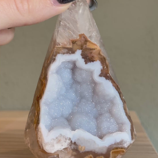 Deze agaat geode toren is van A kwaliteit en dat zie je meteen. Mooie, heldere lagen aan de buitenkant en een prachtig open kristalhart vol kleine fonkelende kristalletjes (druzy).