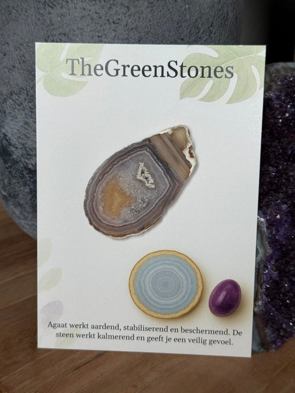Bij de kaart staat een leuke illustratie afgebeeld, en een werking: Agaat werkt aardend, stabiliserend en beschermend. De steen werkt kalmerend en geeft je een veilig gevoel.