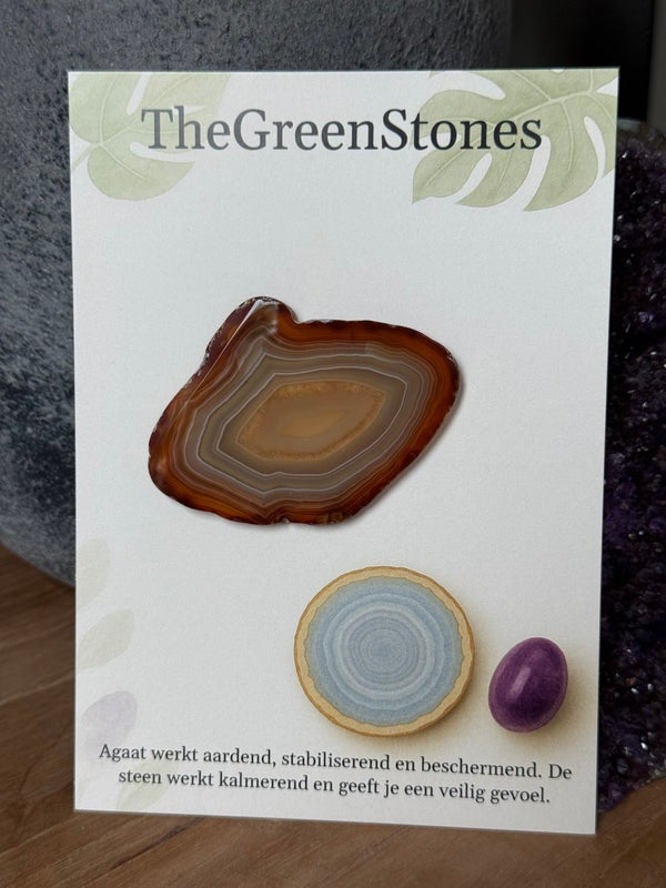 Bij de kaart staat een leuke illustratie afgebeeld, en een werking: Agaat werkt aardend, stabiliserend en beschermend. De steen werkt kalmerend en geeft je een veilig gevoel.