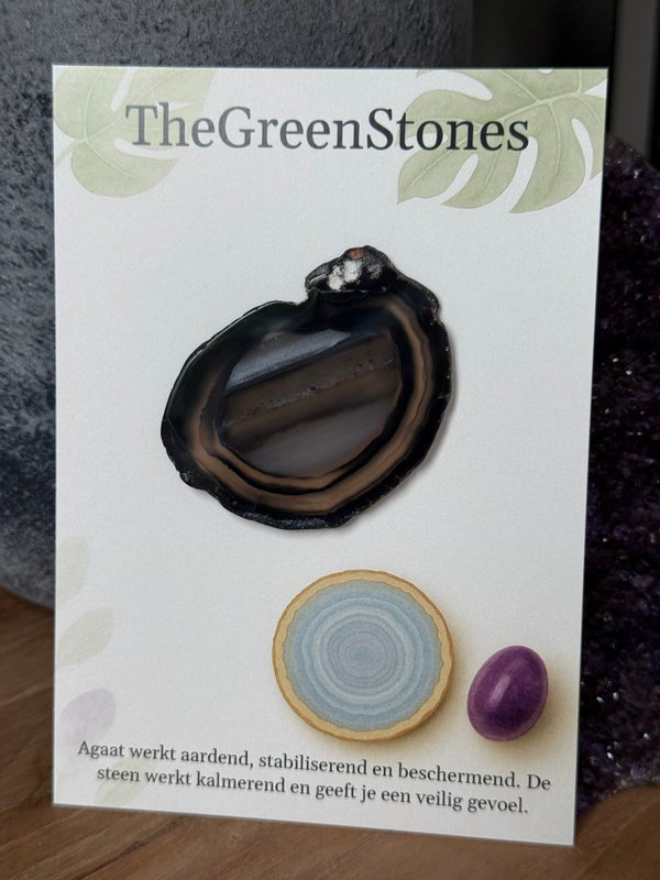 Bij de kaart staat een leuke illustratie afgebeeld, en een werking: Agaat werkt aardend, stabiliserend en beschermend. De steen werkt kalmerend en geeft je een veilig gevoel.