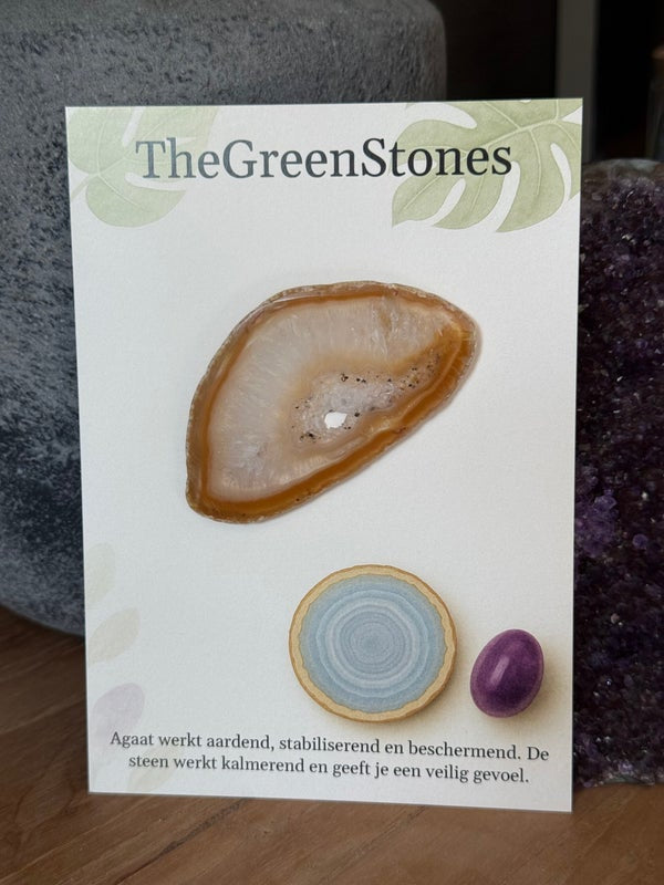 Bij de kaart staat een leuke illustratie afgebeeld, en een werking: Agaat werkt aardend, stabiliserend en beschermend. De steen werkt kalmerend en geeft je een veilig gevoel.