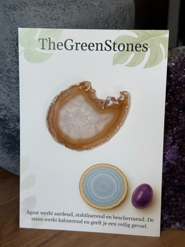 Bij de kaart staat een leuke illustratie afgebeeld, en een werking: Agaat werkt aardend, stabiliserend en beschermend. De steen werkt kalmerend en geeft je een veilig gevoel.