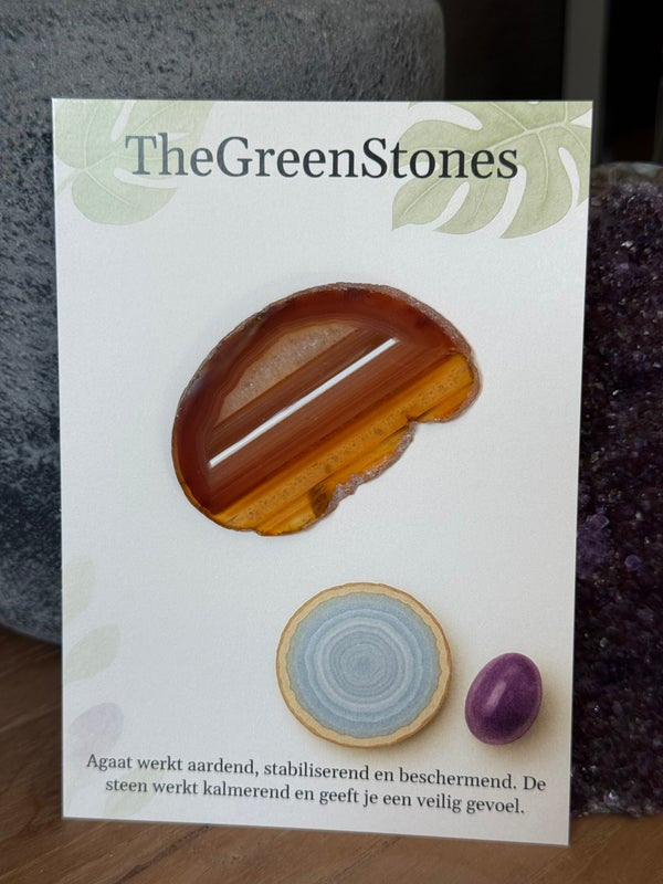 Bij de kaart staat een leuke illustratie afgebeeld, en een werking: Agaat werkt aardend, stabiliserend en beschermend. De steen werkt kalmerend en geeft je een veilig gevoel.