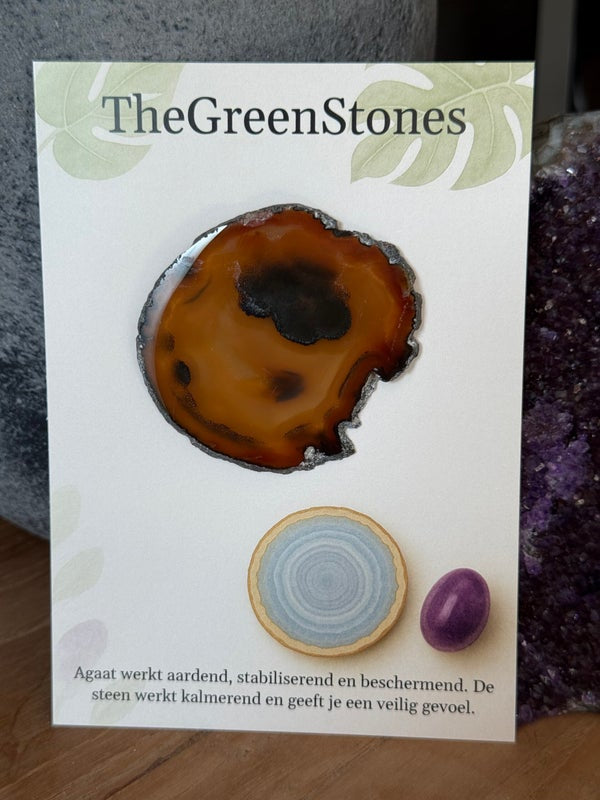 Bij de kaart staat een leuke illustratie afgebeeld, en een werking: Agaat werkt aardend, stabiliserend en beschermend. De steen werkt kalmerend en geeft je een veilig gevoel.