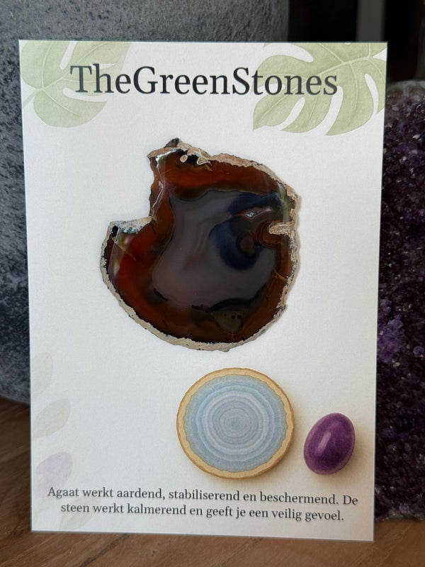 Bij de kaart staat een leuke illustratie afgebeeld, en een werking: Agaat werkt aardend, stabiliserend en beschermend. De steen werkt kalmerend en geeft je een veilig gevoel.