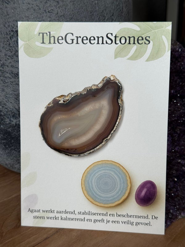 Bij de kaart staat een leuke illustratie afgebeeld, en een werking: Agaat werkt aardend, stabiliserend en beschermend. De steen werkt kalmerend en geeft je een veilig gevoel.