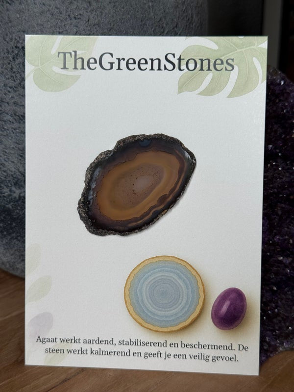 Bij de kaart staat een leuke illustratie afgebeeld, en een werking: Agaat werkt aardend, stabiliserend en beschermend. De steen werkt kalmerend en geeft je een veilig gevoel.