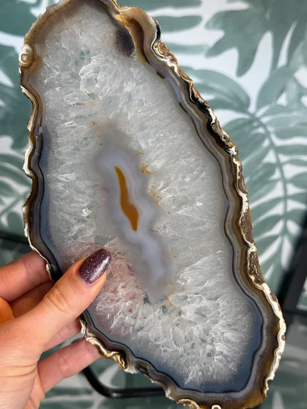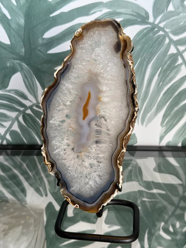 De schijf is gefotografeerd op een standaard voor een agaat schijf. Deze is los bij te bestellen.