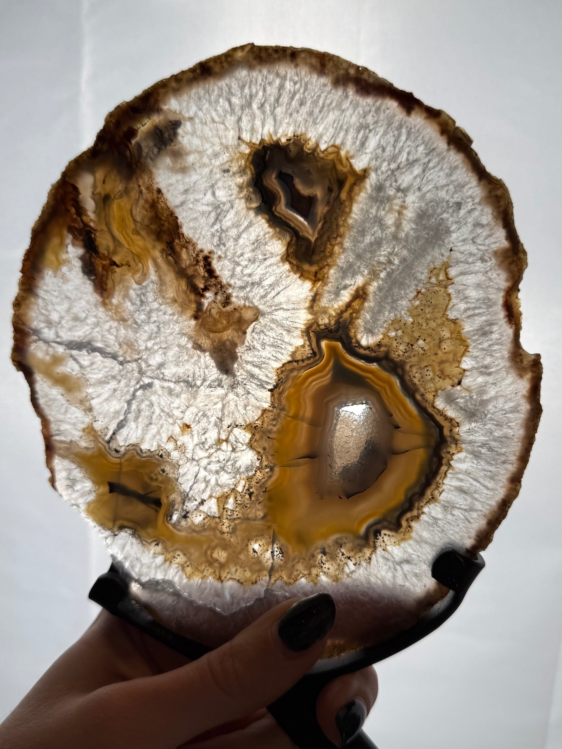 De agaatschijven worden geleverd op een luxe standaard. Zo kun je ze meteen neerzetten en krijgen ze een chique en rustige uitstraling in huis.