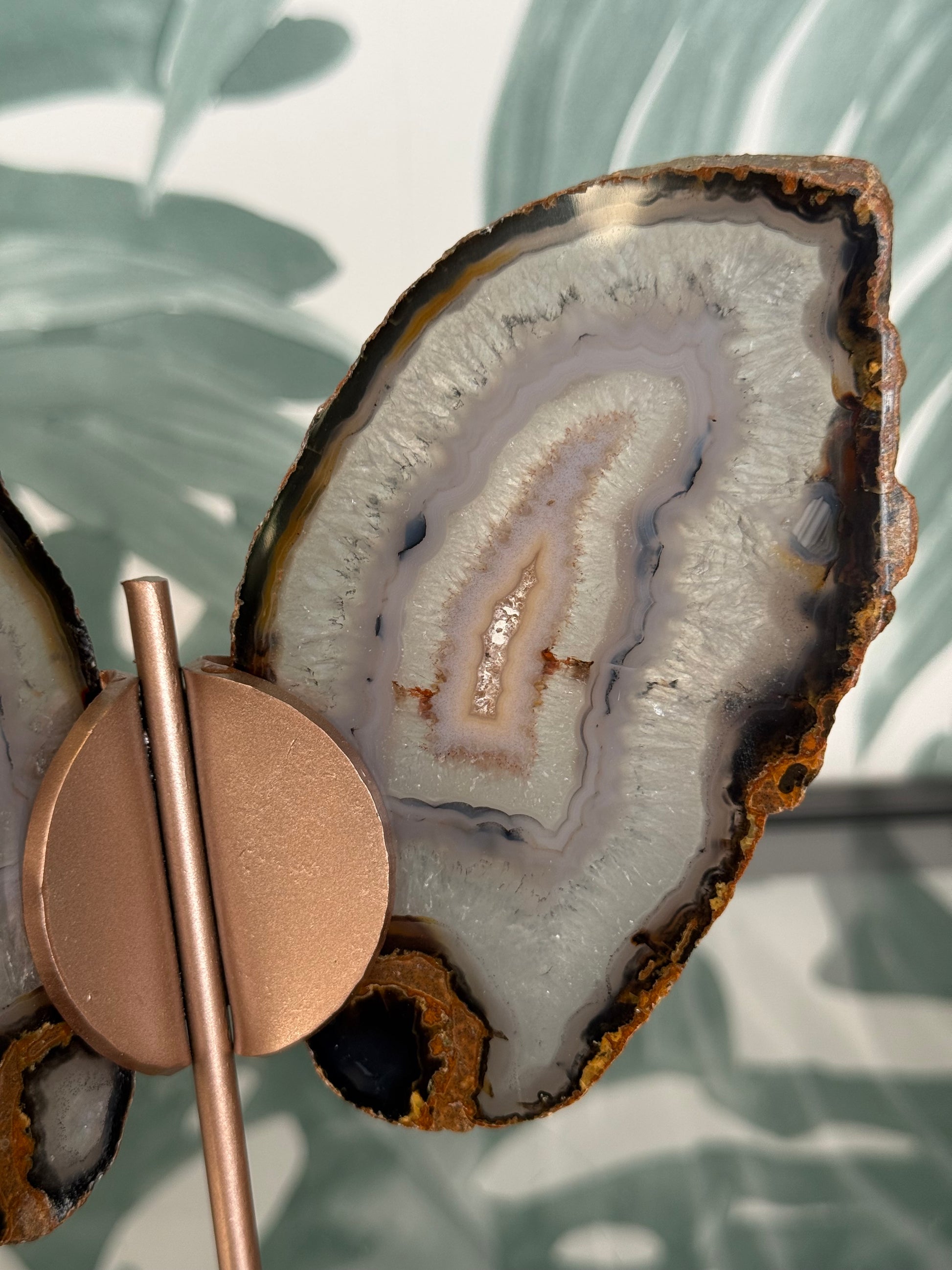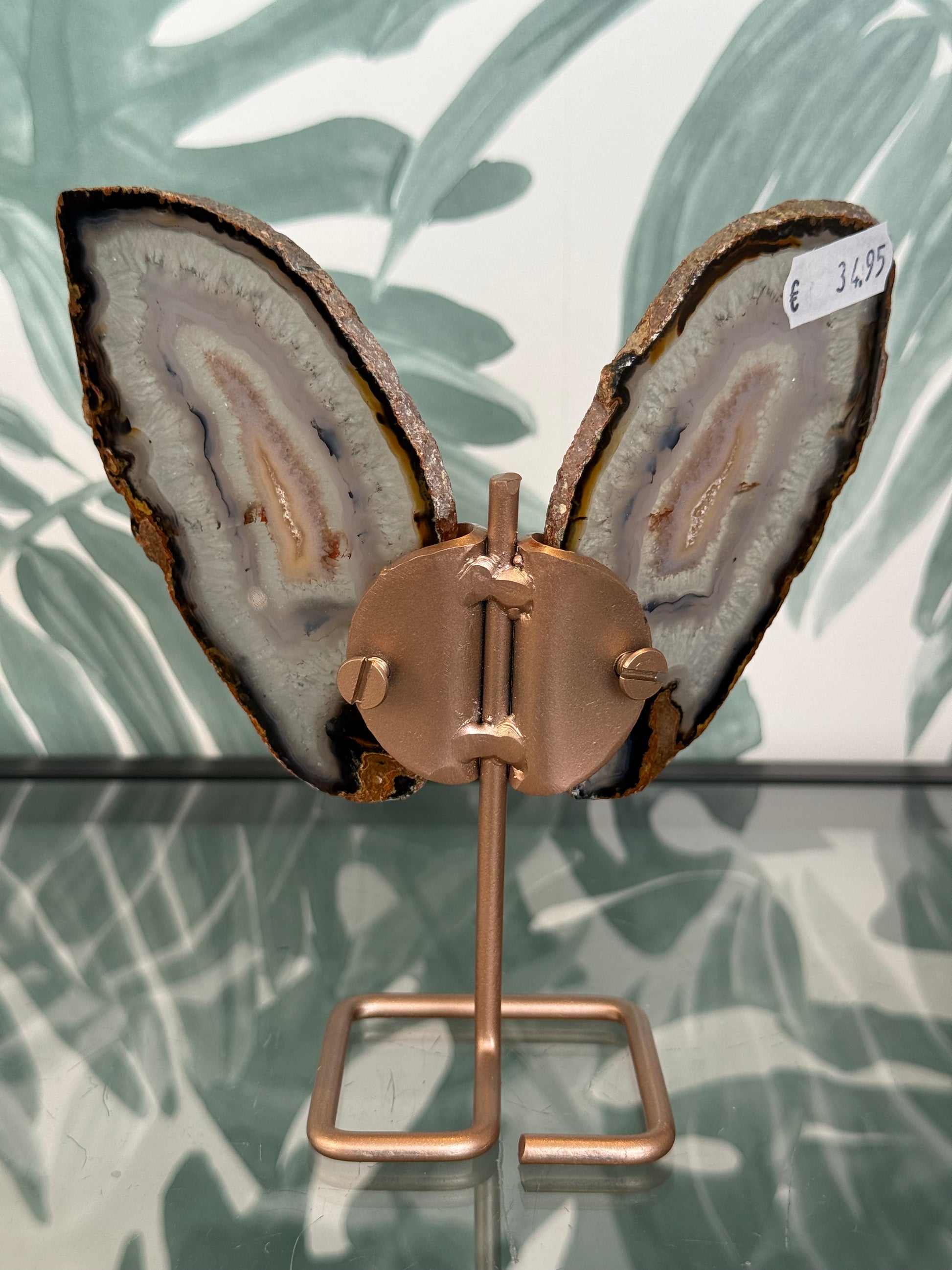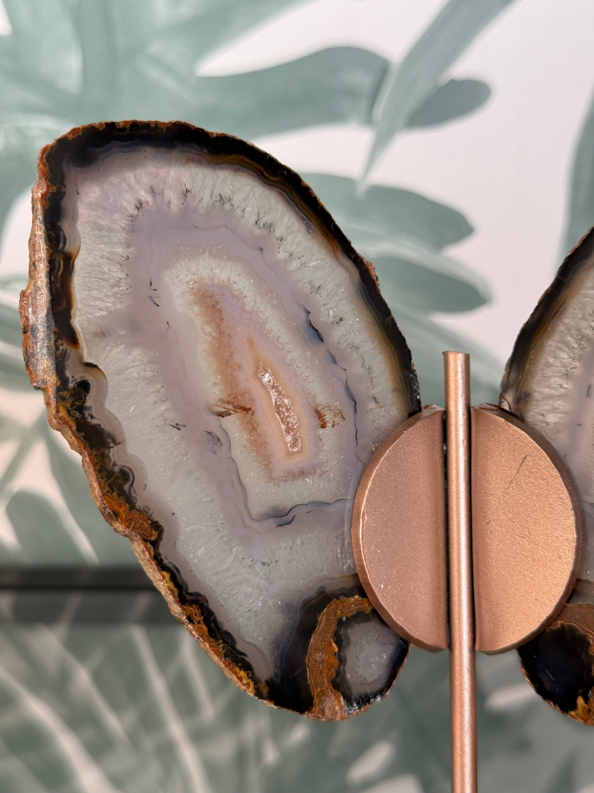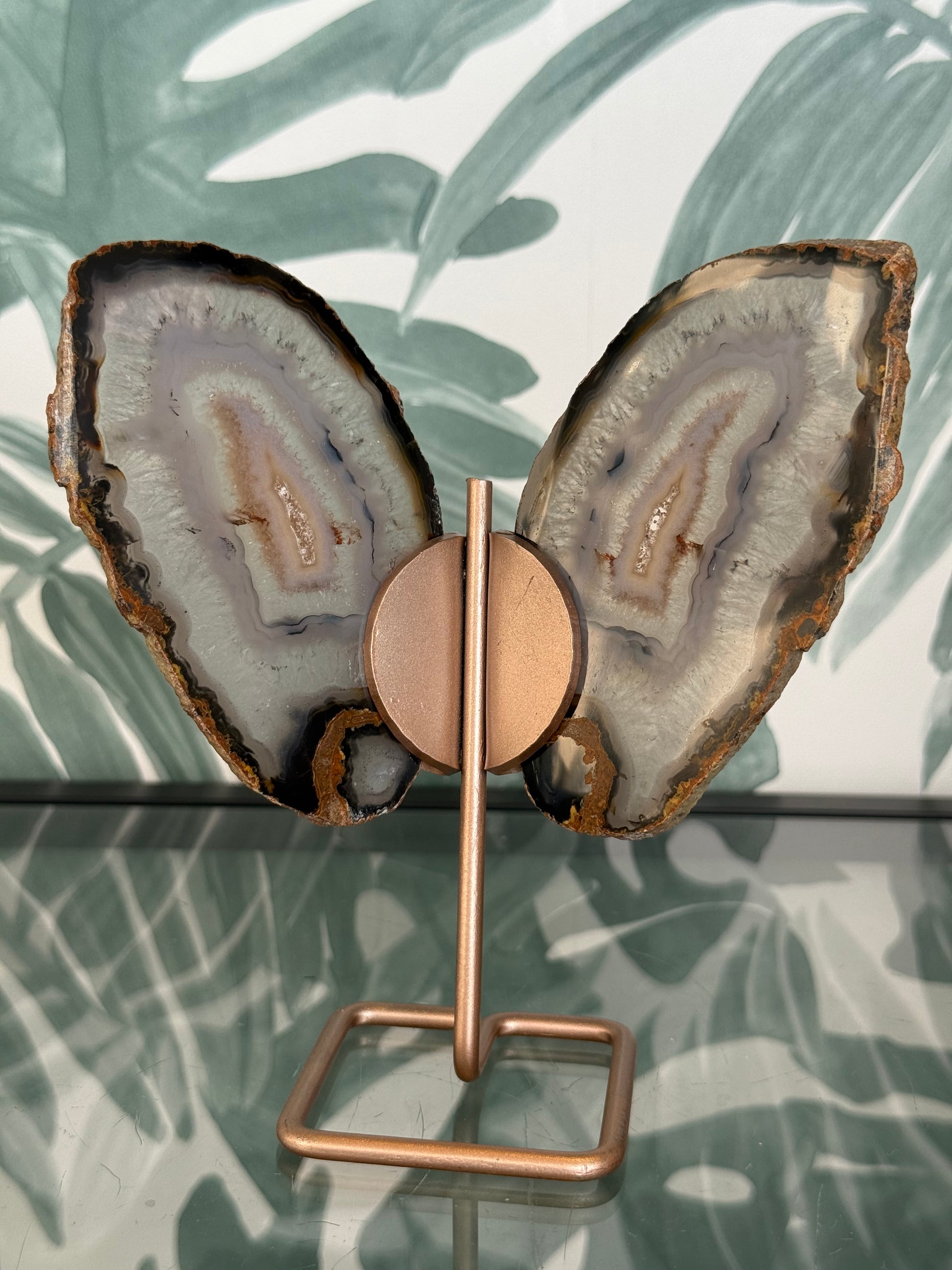Deze prachtige agaat vlinder is gemaakt van twee gepolijste agaatplaten die samen de vorm van elegante vleugels creëren. De natuurlijke tekeningen en aardetinten van de steen maken elke vlinder uniek. De metalen standaard geeft het geheel een luxe, moderne uitstraling.