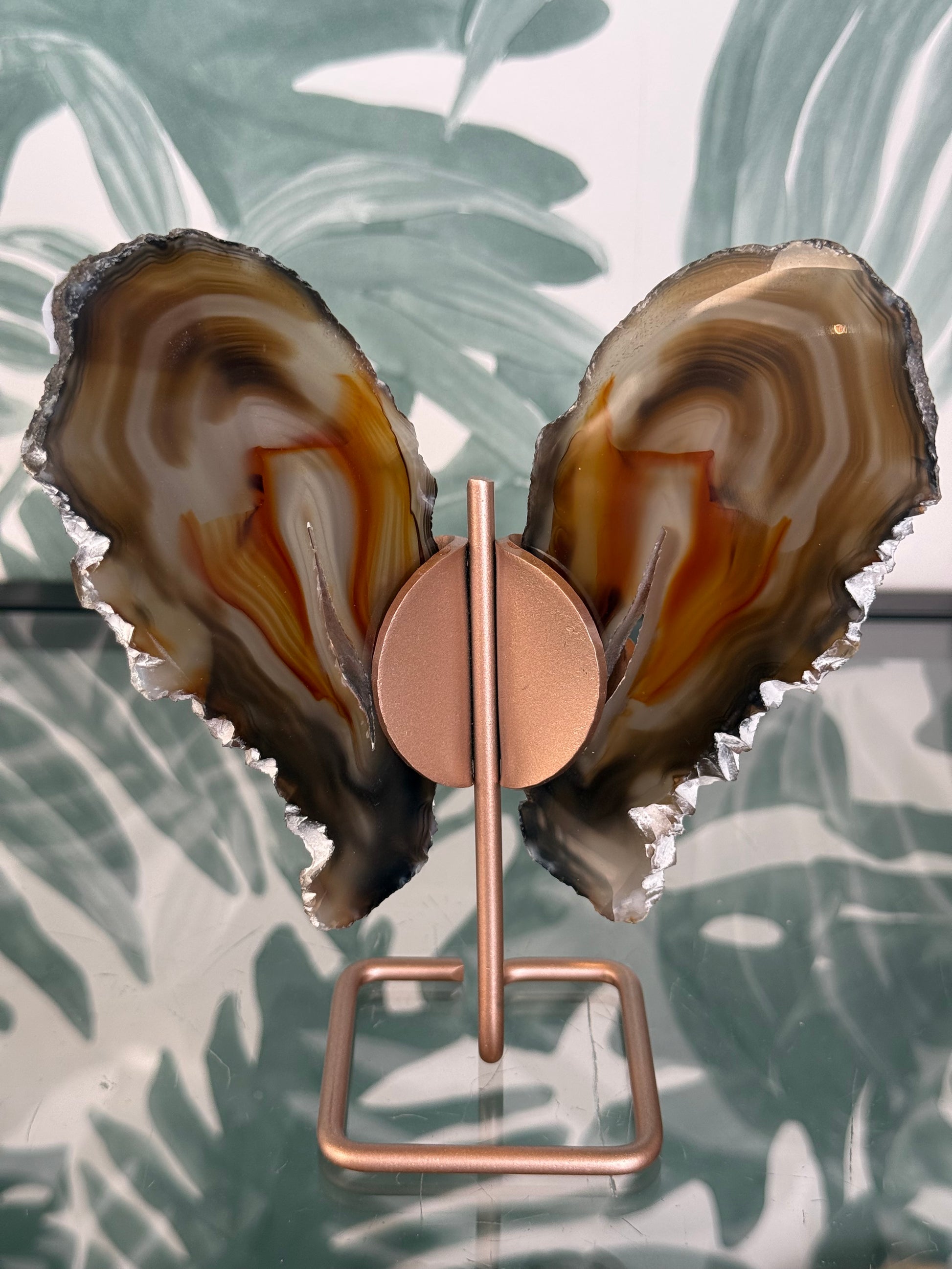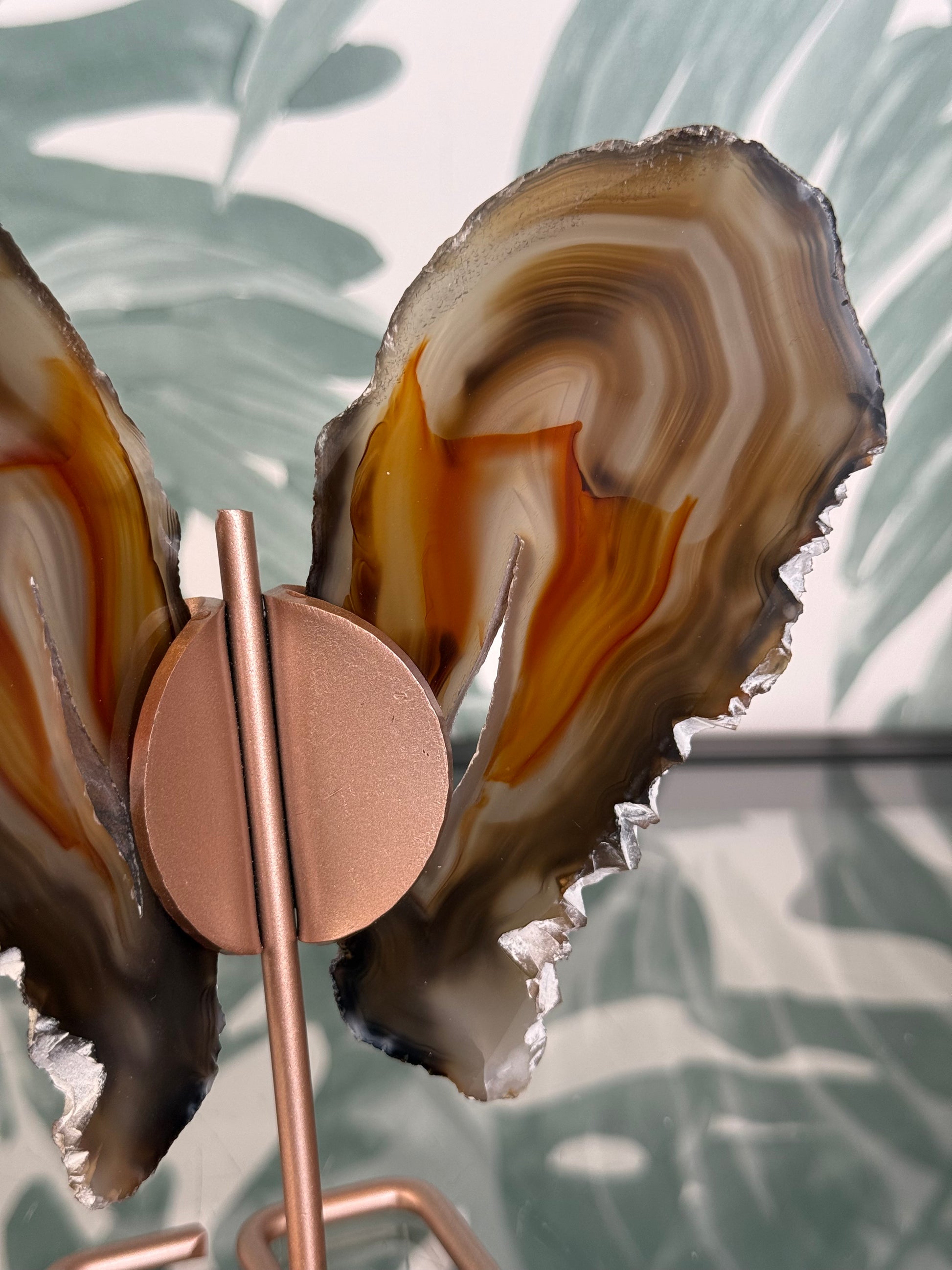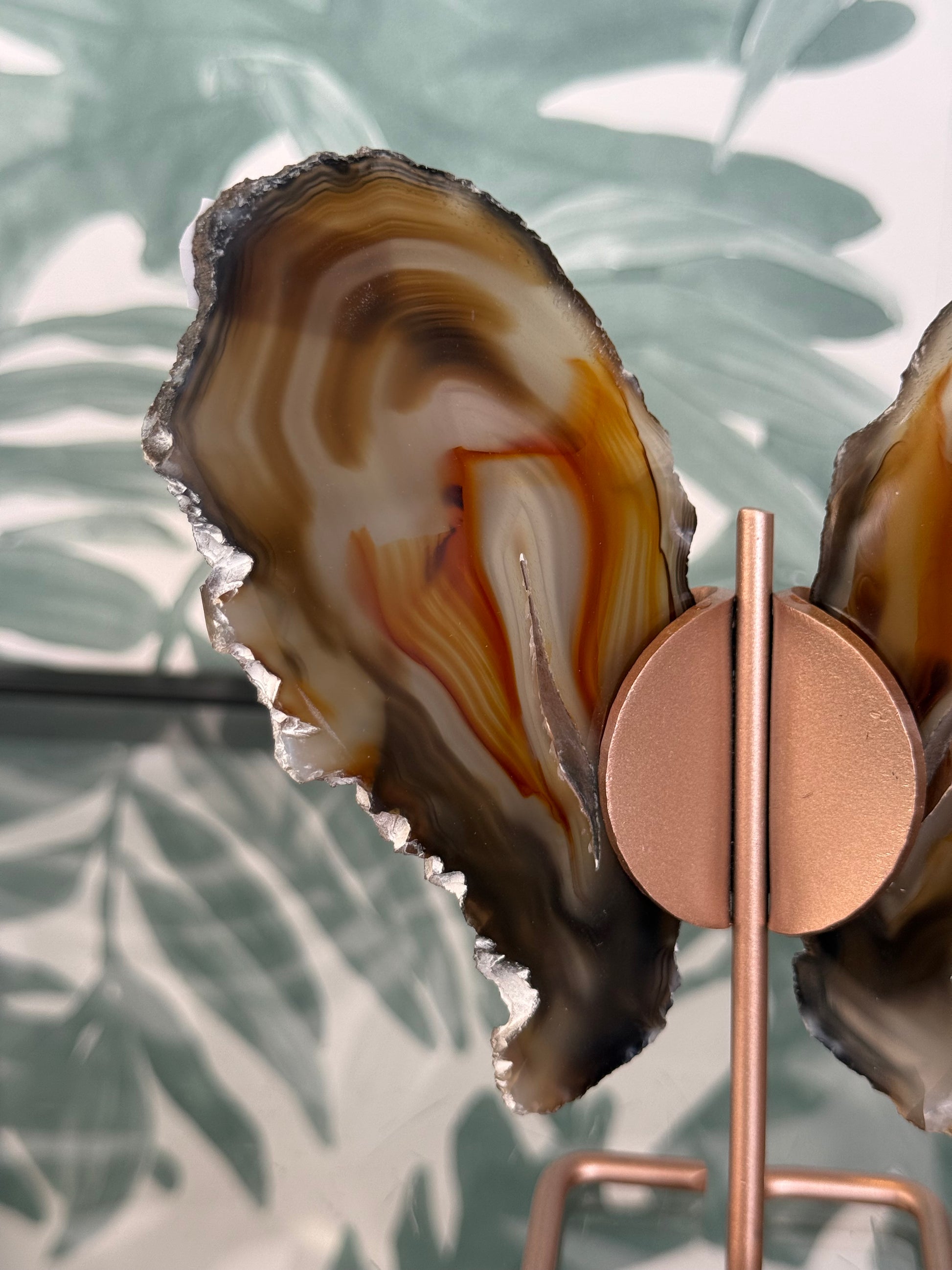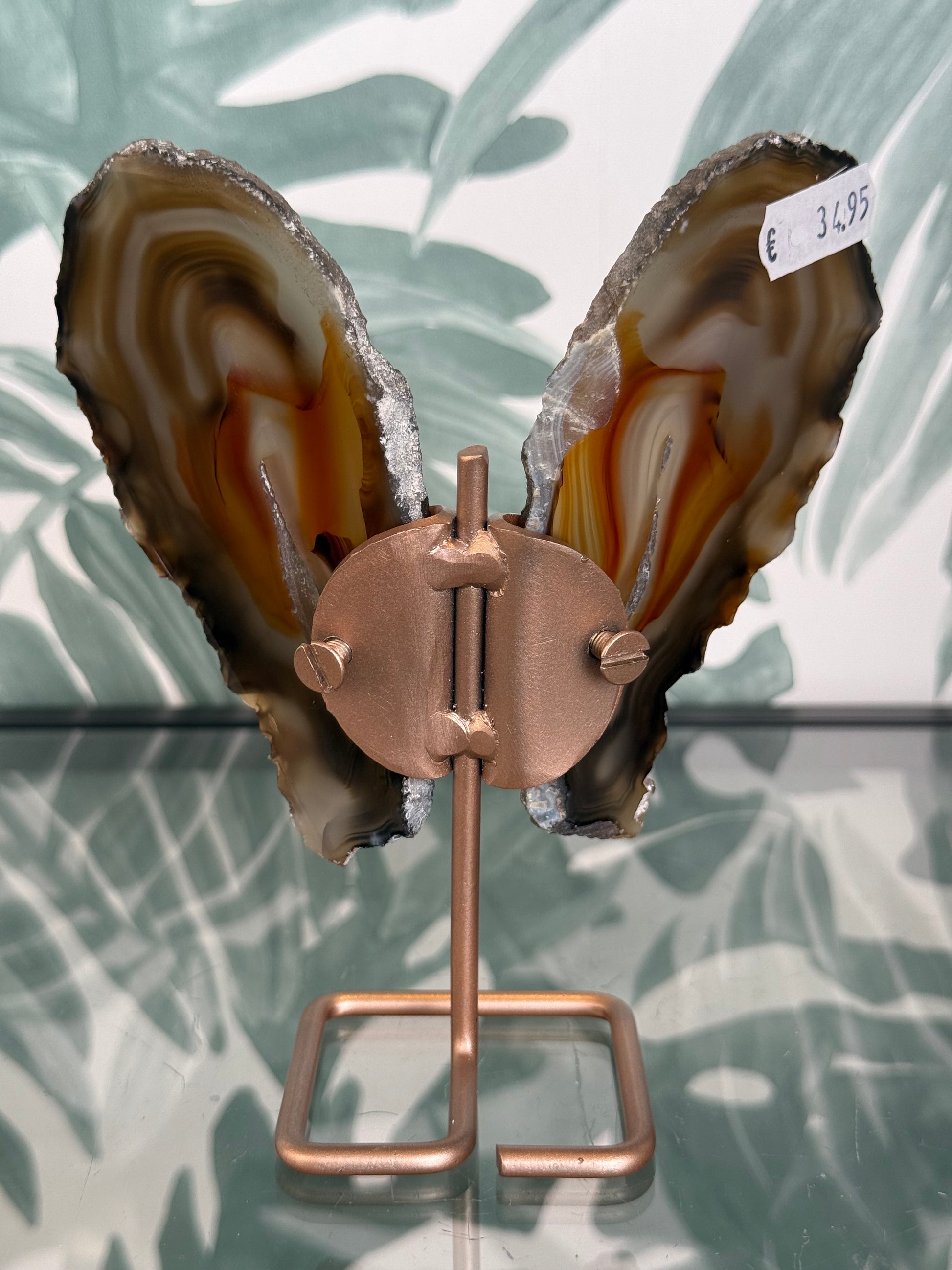Deze prachtige agaat vlinder is gemaakt van twee gepolijste agaatplaten die samen de vorm van elegante vleugels creëren. De natuurlijke tekeningen en aardetinten van de steen maken elke vlinder uniek. De metalen standaard geeft het geheel een luxe, moderne uitstraling.