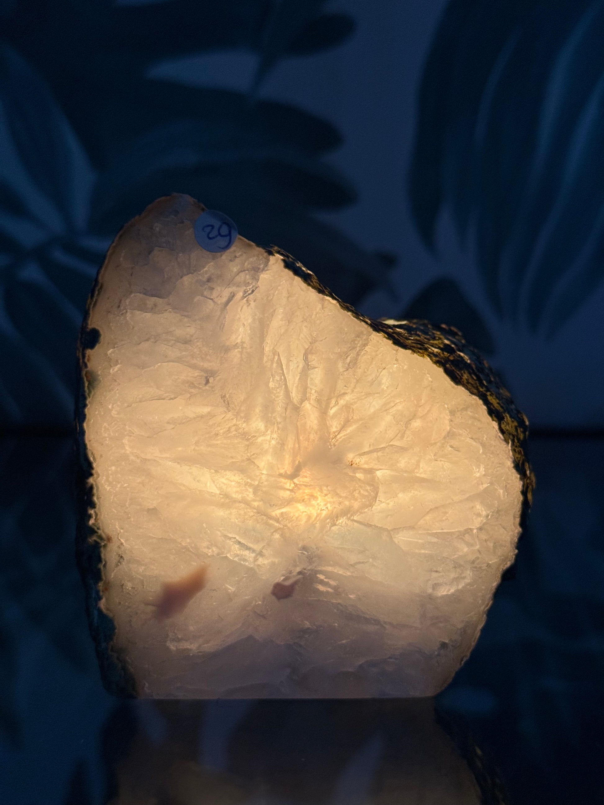 Elke houder is uniek in vorm, tekening en kleur – een waar kunstwerk van de natuur. Wanneer het waxinelichtje brandt, lichten de kristallagen subtiel op en ontstaat er een warme, rustgevende gloed.