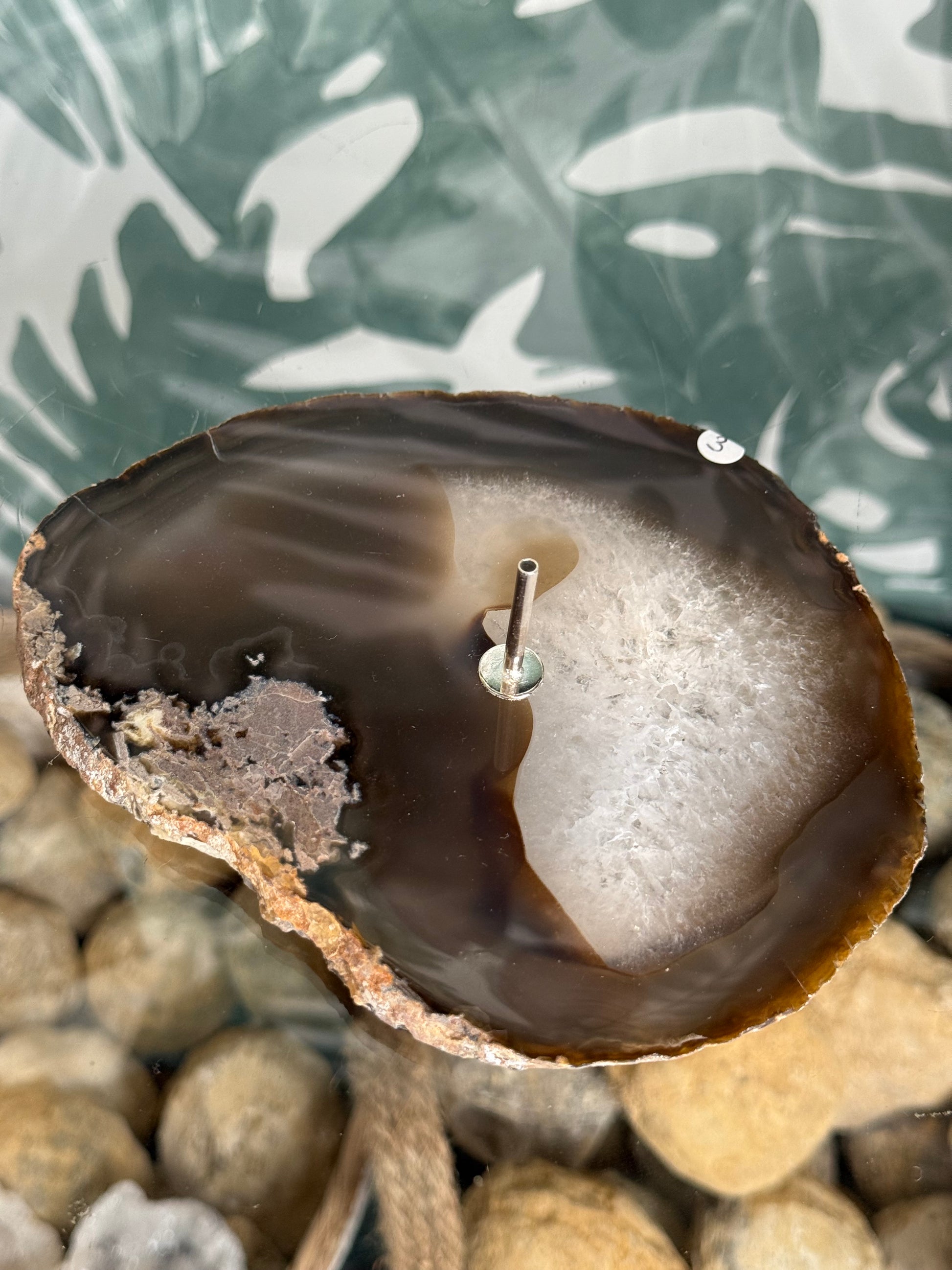 Deze stijlvolle wierookhouder is gemaakt van een prachtige gepolijste agaat schijf. De natuurlijke lijnen en kristalstructuren maken ieder exemplaar uniek. In het midden bevindt zich een metalen houdertje voor wierookstokjes.