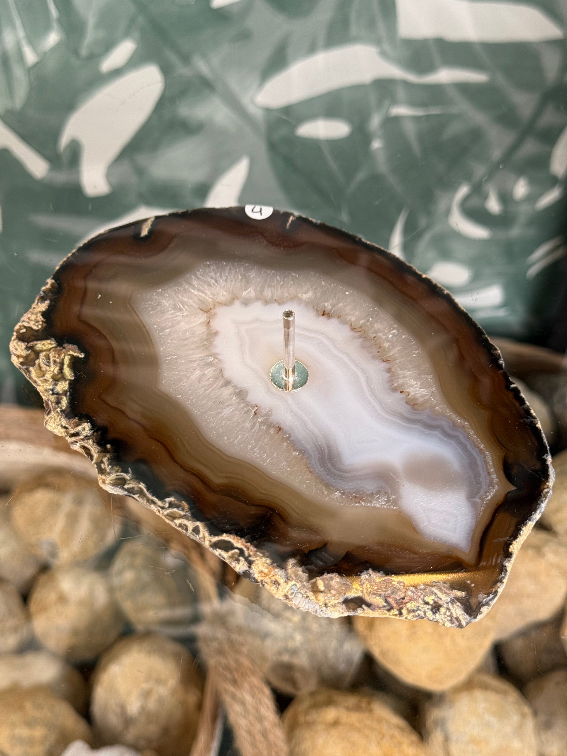 Deze stijlvolle wierookhouder is gemaakt van een prachtige gepolijste agaat schijf. De natuurlijke lijnen en kristalstructuren maken ieder exemplaar uniek. In het midden bevindt zich een metalen houdertje voor wierookstokjes.