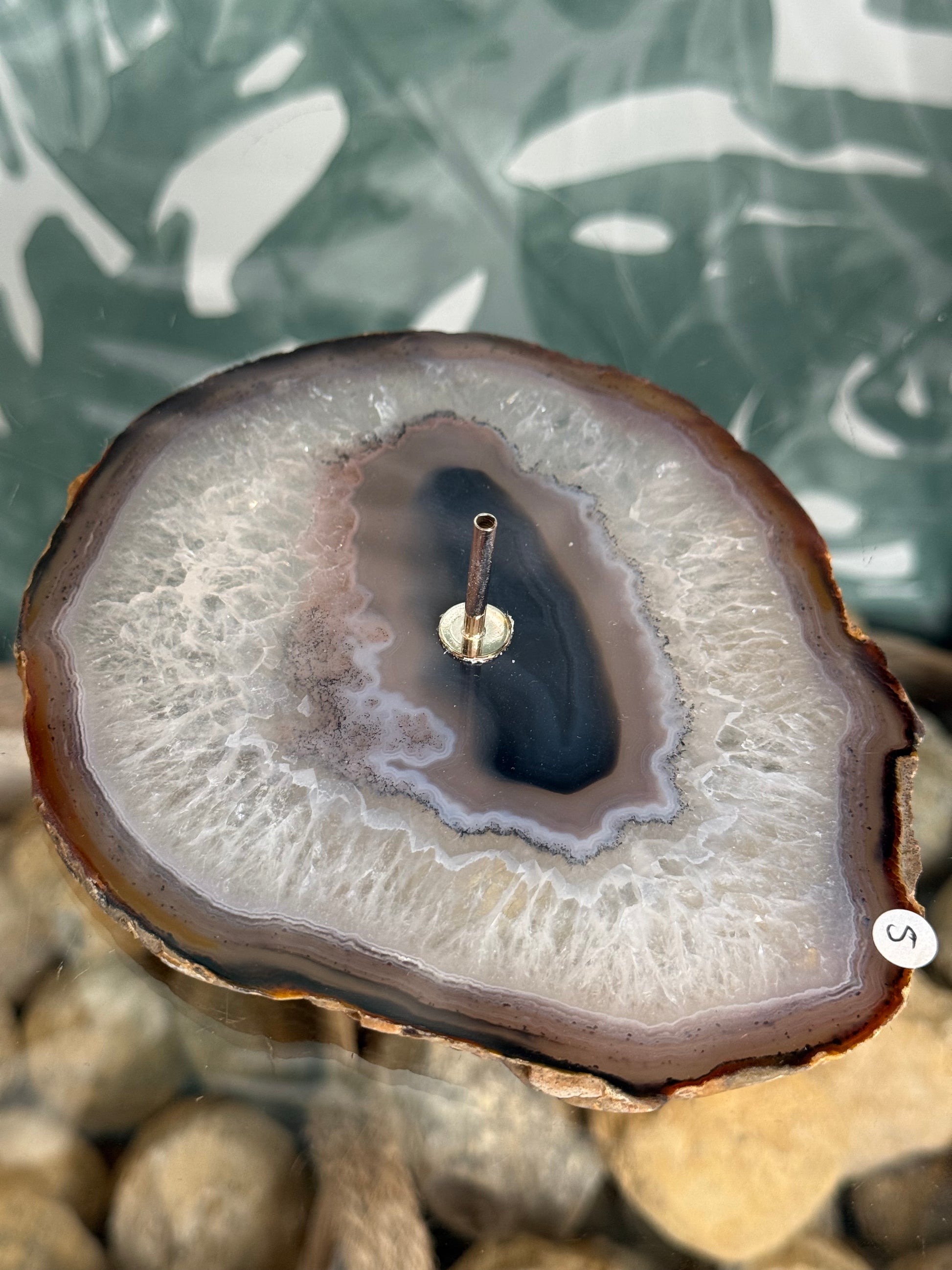 Deze stijlvolle wierookhouder is gemaakt van een prachtige gepolijste agaat schijf. De natuurlijke lijnen en kristalstructuren maken ieder exemplaar uniek. In het midden bevindt zich een metalen houdertje voor wierookstokjes.