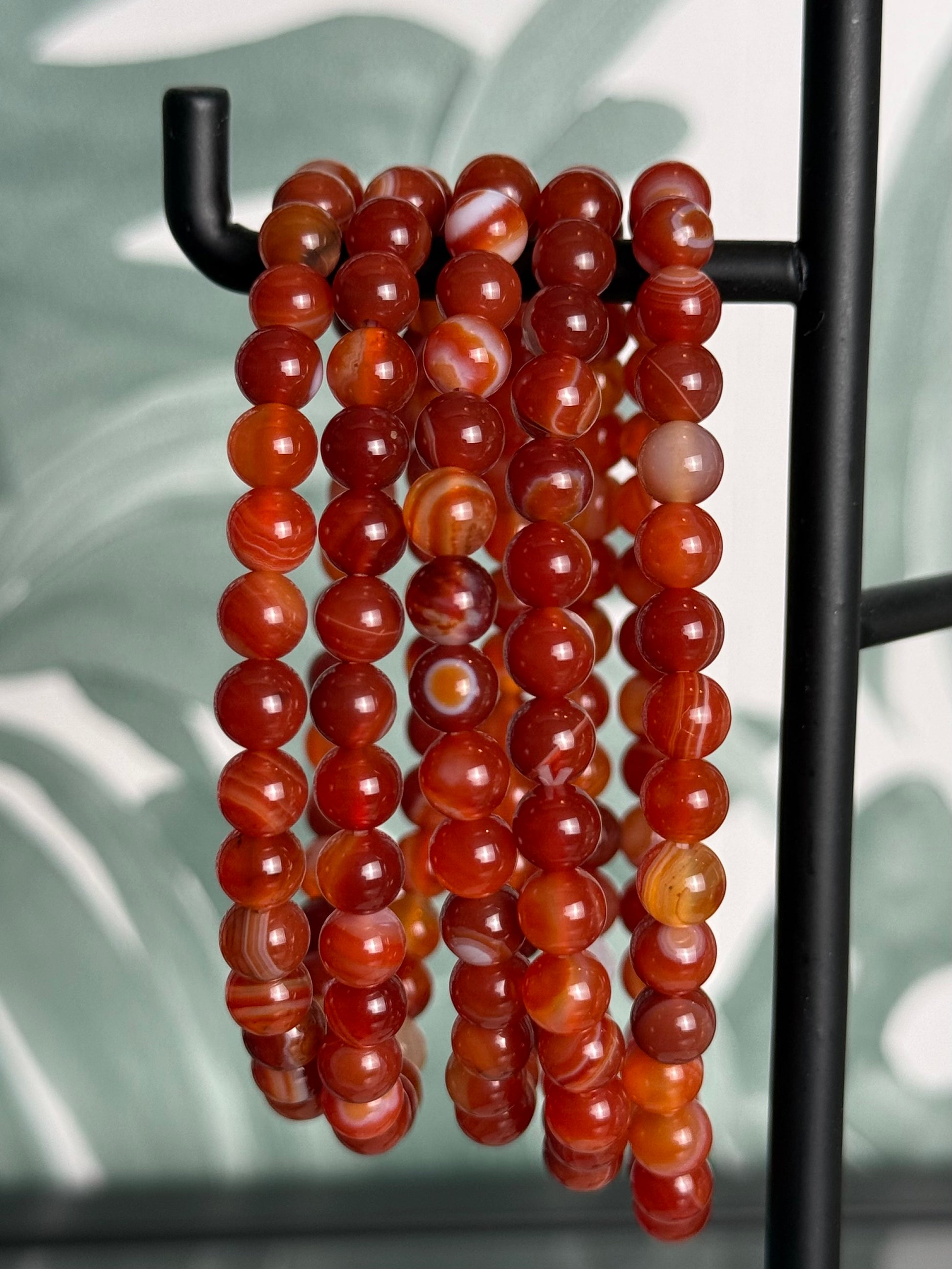 Deze Carneool armband (8 mm) bestaat uit natuurlijke, gebande carneoolstenen met prachtige rood-oranje tinten en lichte strepen die elke armband uniek maken.