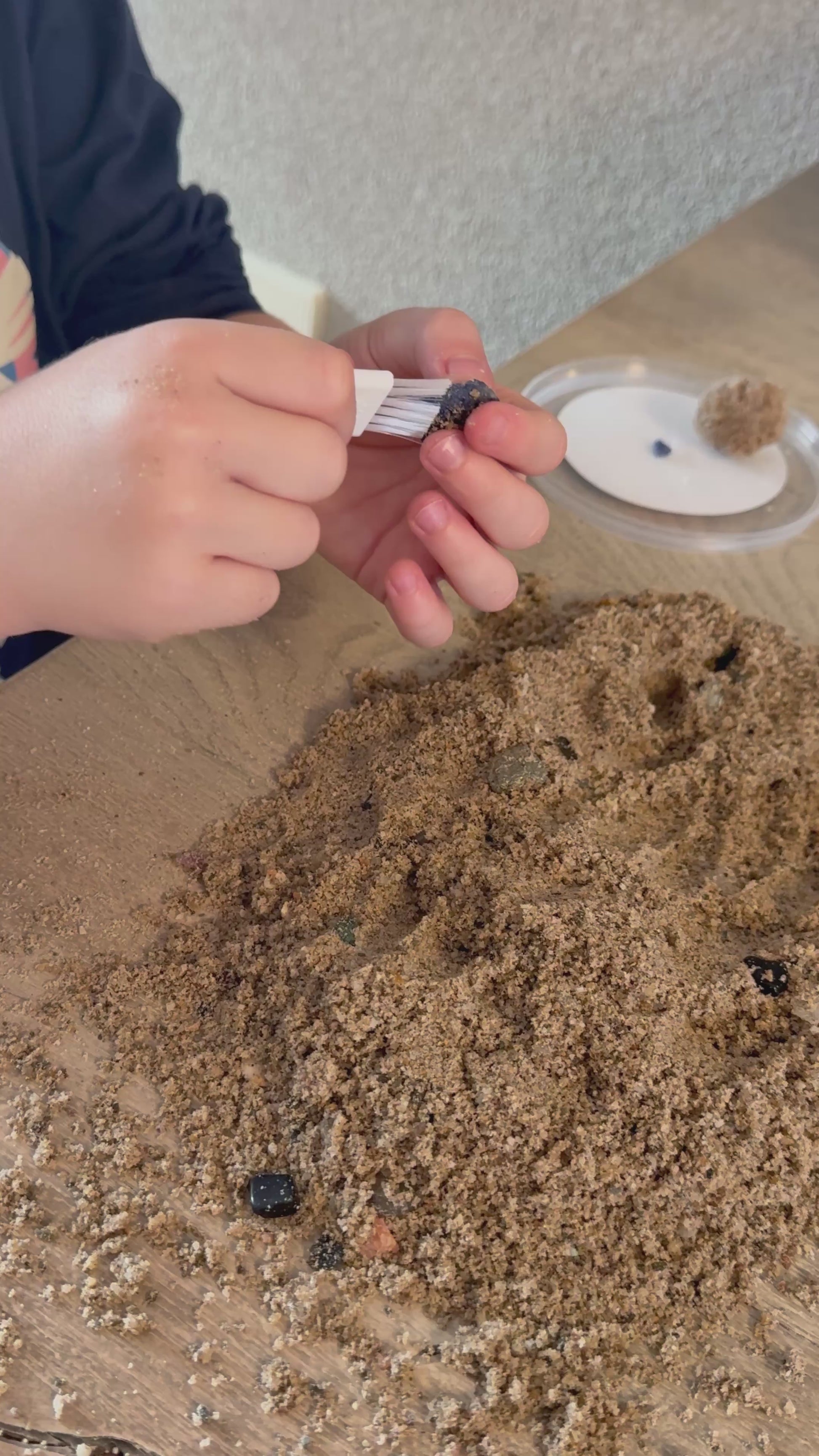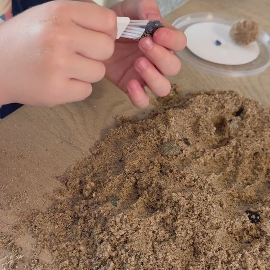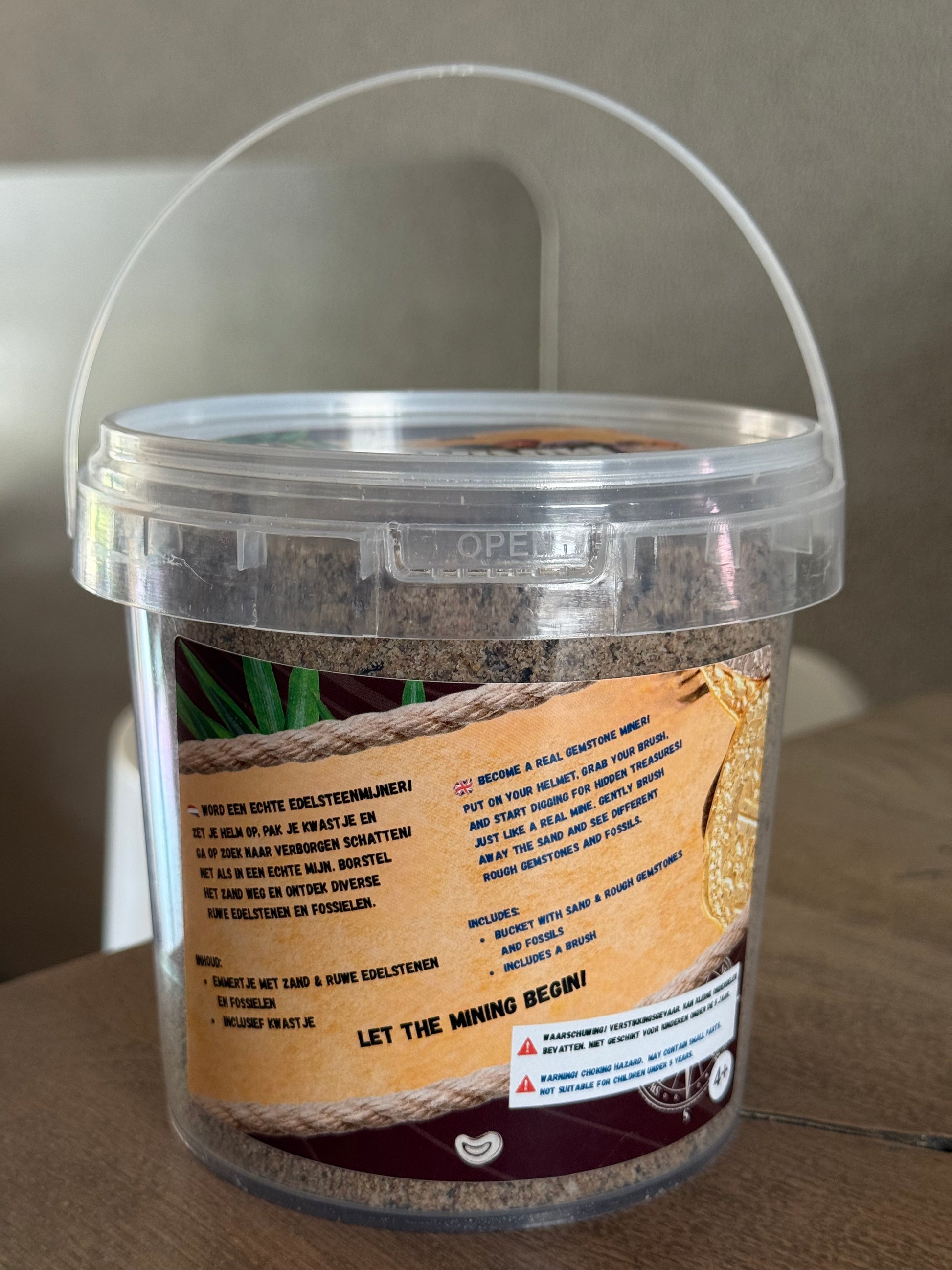 Zet je helm op, pak je kwastje en ga opzoek naar verborgen schatten. Net als in een echte mijn. Borstel het zand weg en ontdek diverse ruwe edelstenen en fossielen