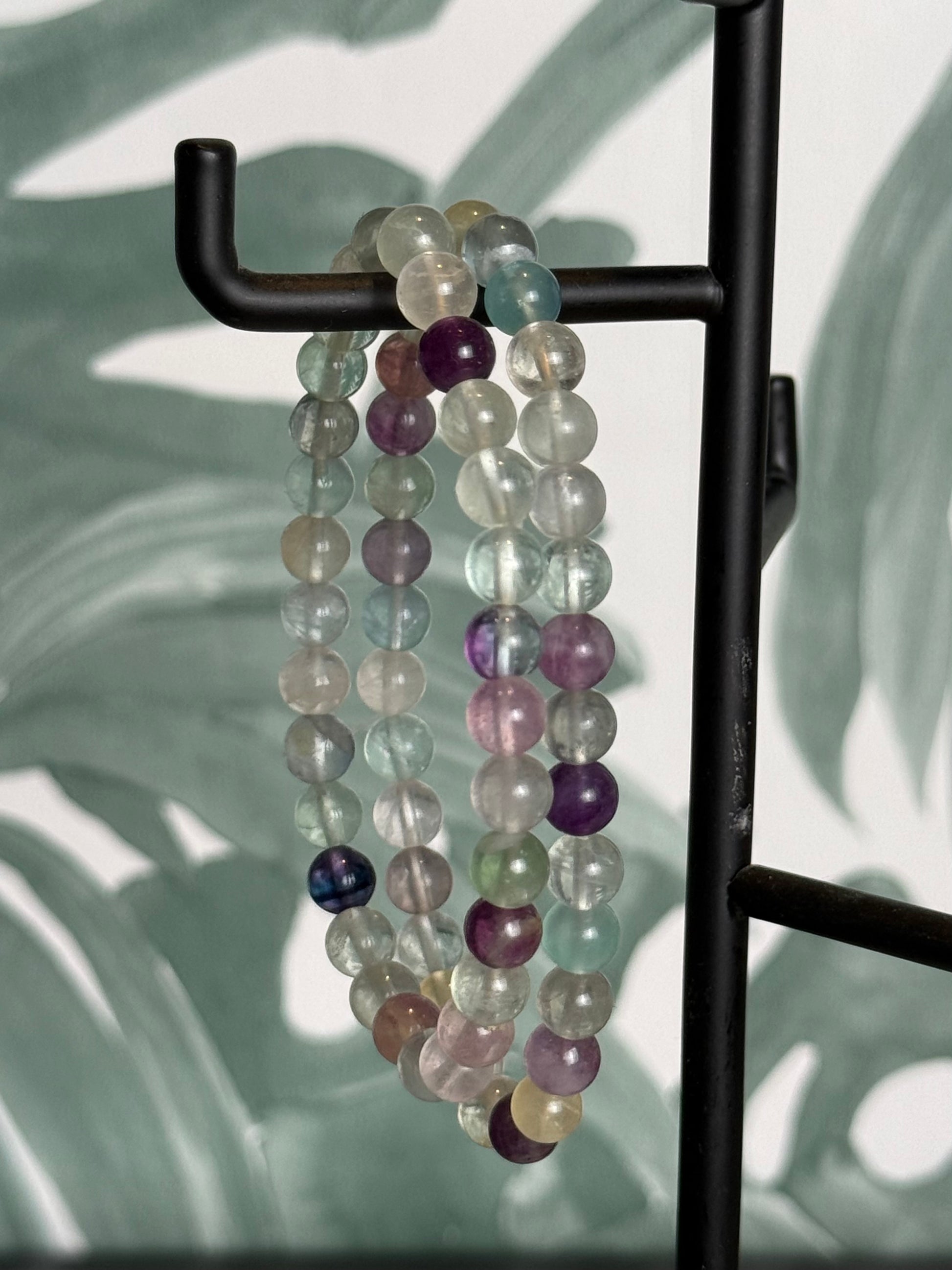 De Fluoriet armband – 6 mm is samengesteld uit gladgepolijste kralen in natuurlijke tinten groen, paars en transparant.