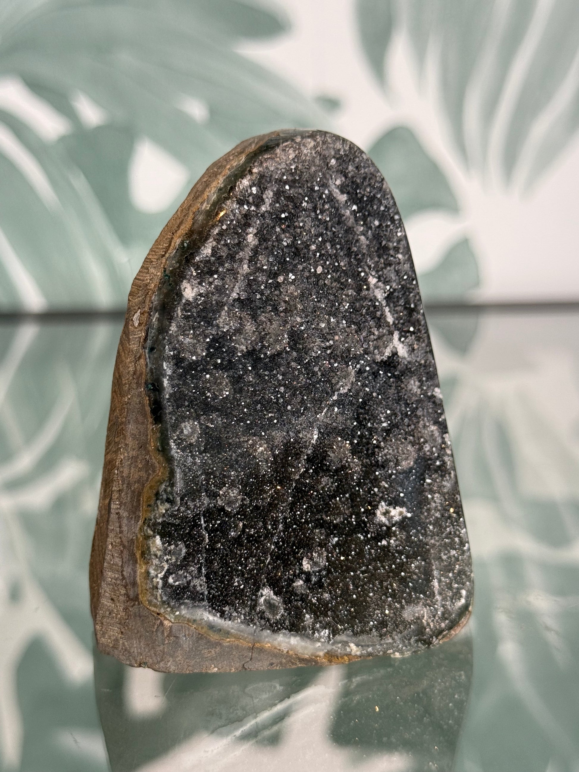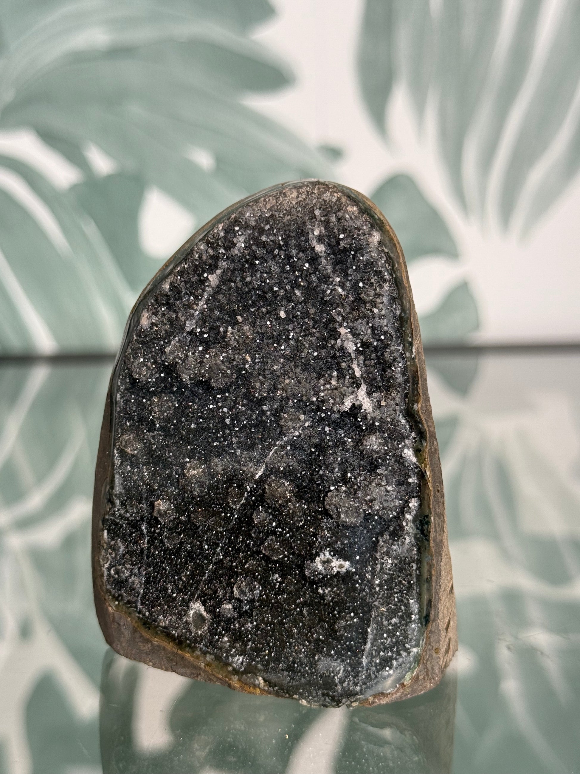Deze schitterende Galaxy Amethist geode betovert met haar diep donkere kleur en fonkelende kristallen. De naam Galaxy verwijst naar de sprankelende uitstraling die doet denken aan een sterrenhemel. Dankzij het vlakke ondervlak staat de steen stevig, perfect als decoratief accent of spirituele toevoeging aan je ruimte.