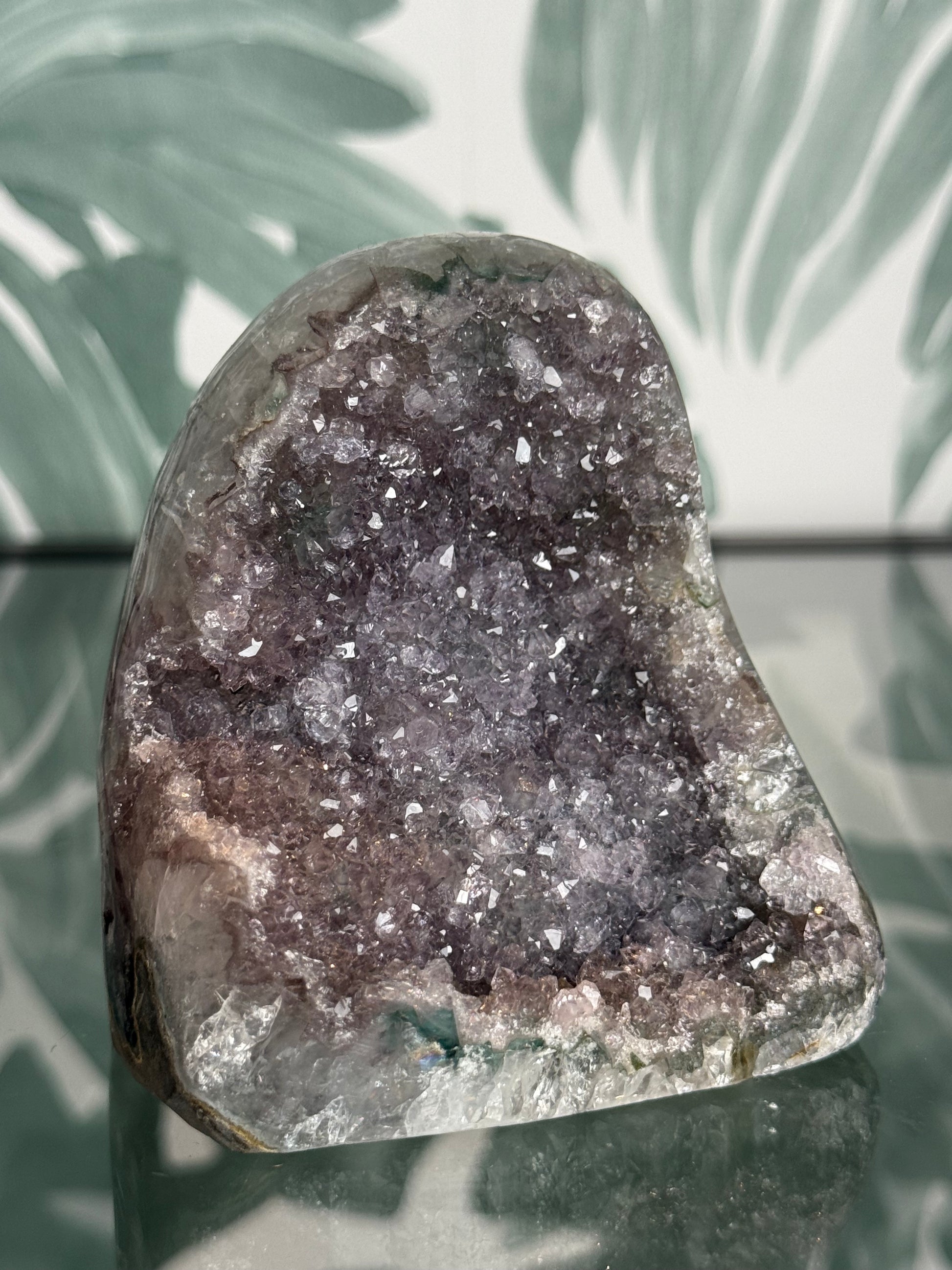 Deze prachtige Galaxy Amethist geode straalt rust, magie en harmonie uit. De fonkelende kristallen lijken op een sterrenhemel, vandaar de naam Galaxy Amethist.