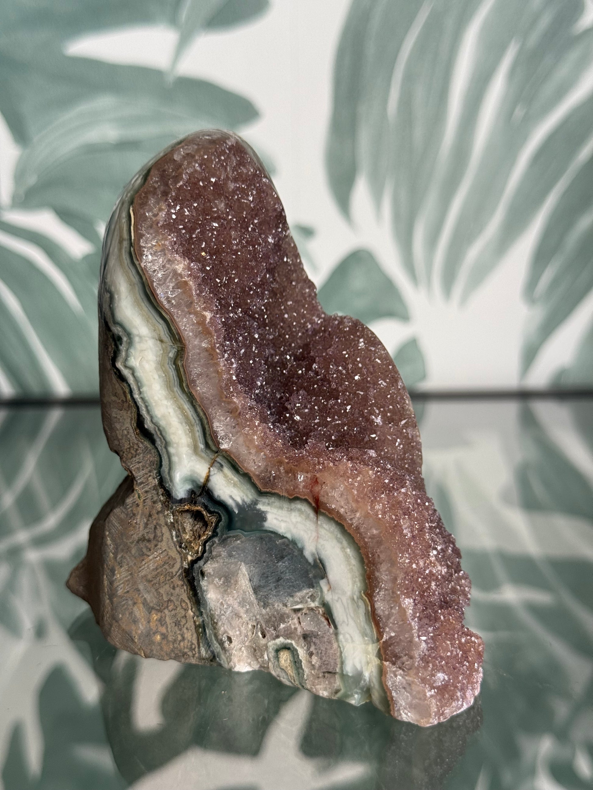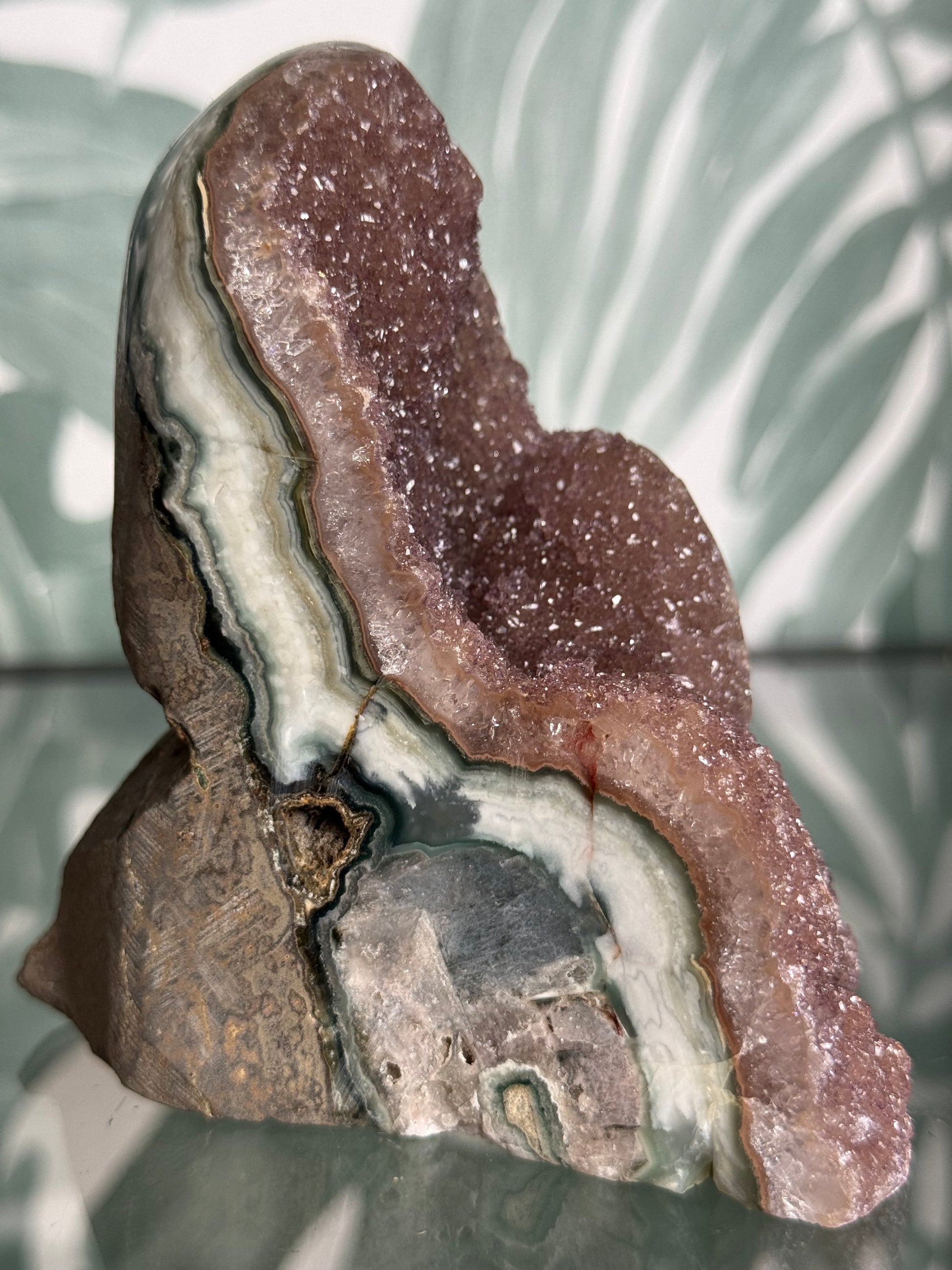Laat je betoveren door de schittering van deze Galaxy Amethist geode. De fonkelende kristallen lijken op een sterrenhemel, omlijst door prachtige natuurlijke patronen in zachte tinten paars, wit en groen.