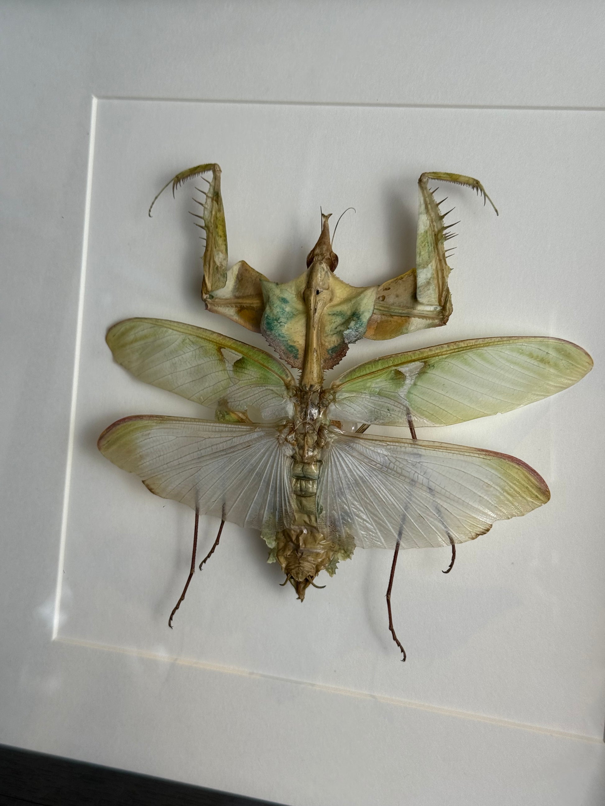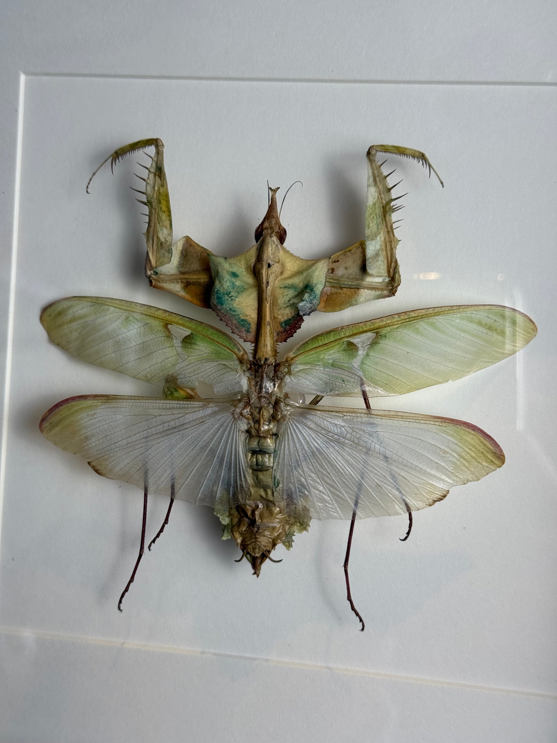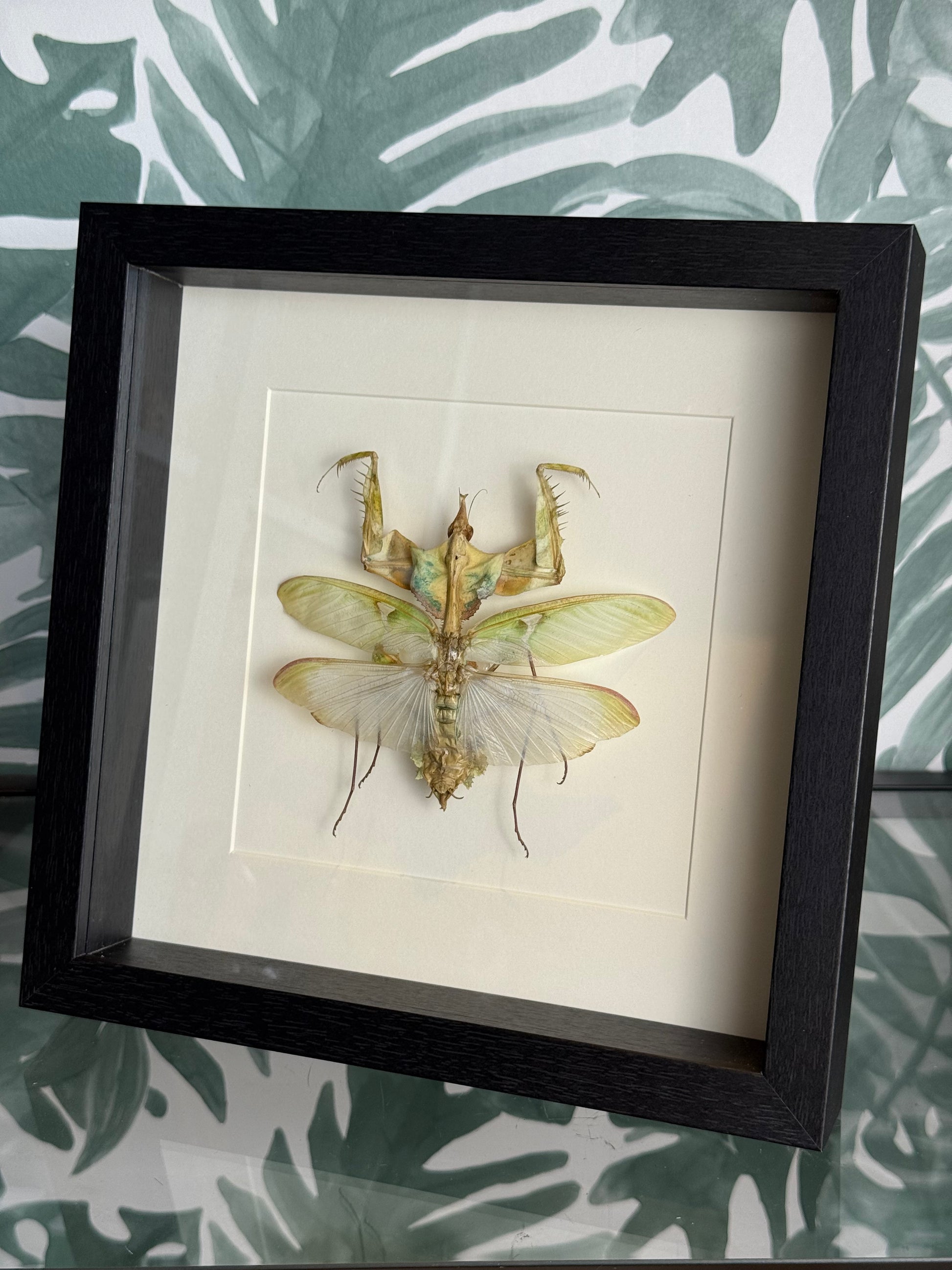 Duivelsbloembidsprinkhaan (Idolomantis diabolica) in zwarte lijst, zorgvuldig geprepareerd en ingelijst met een lichte passe-partout.
