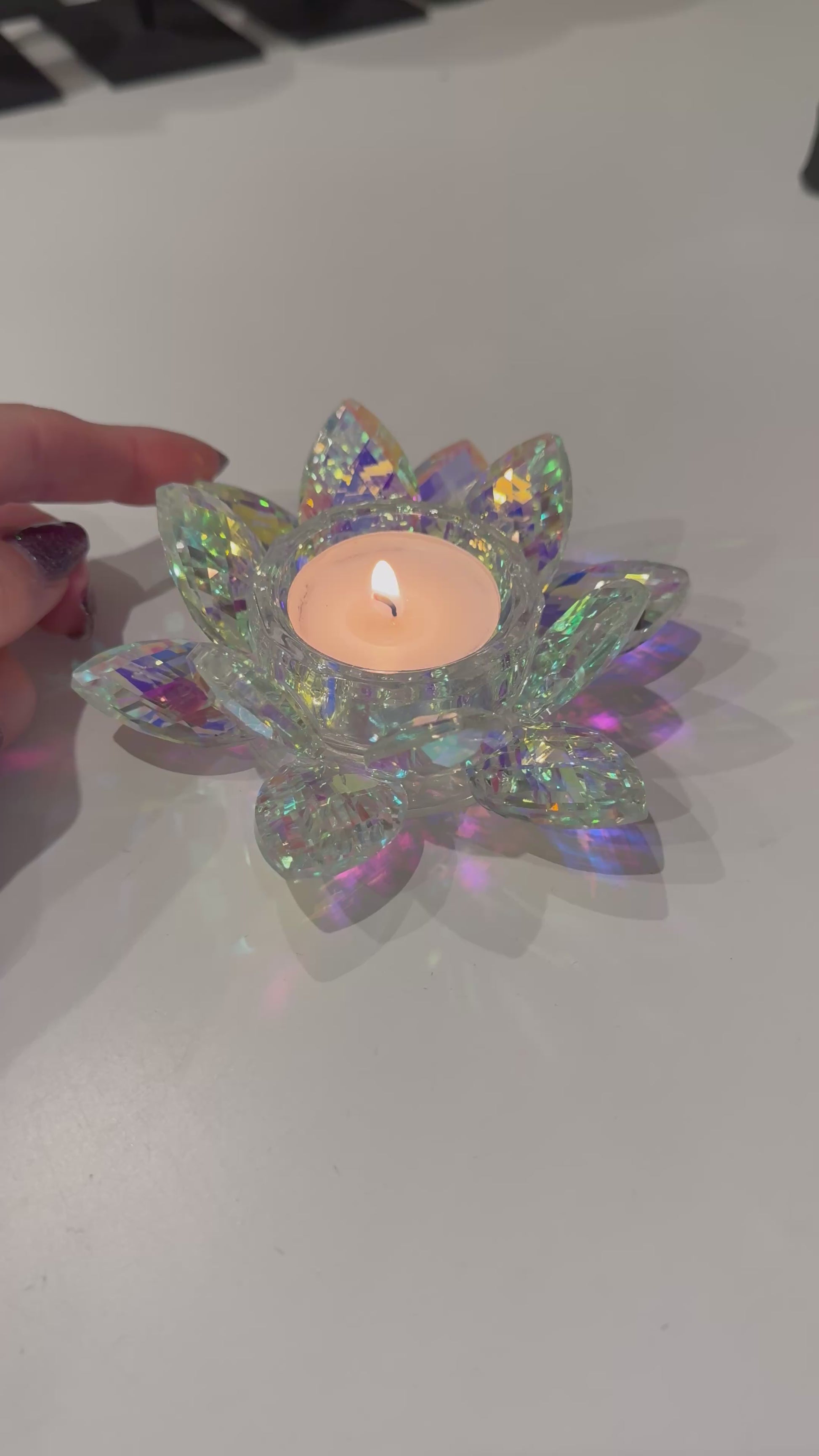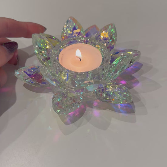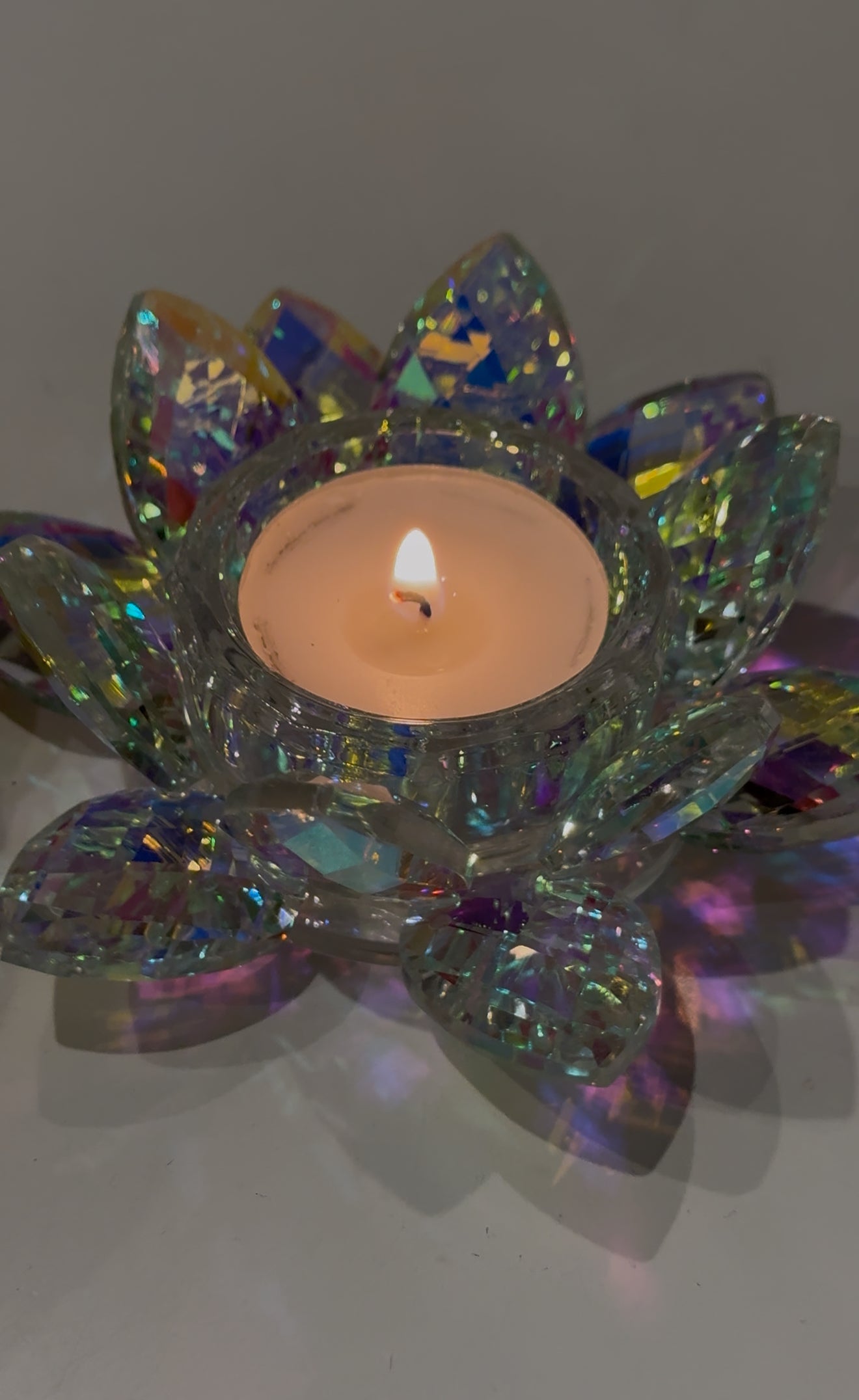 Gemaakt van glas en voorzien van een prachtige auracoating, die het licht in talloze kleuren laat weerkaatsen zodra het kaarsje brandt.