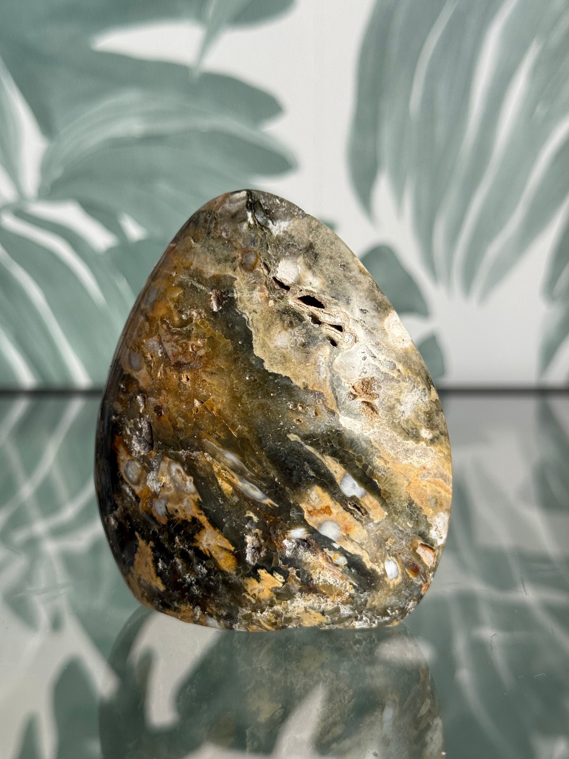 Oceaan jaspis, gepolijst en vrijstaand. Dit stuk heeft een gemêleerd patroon met groen, crème- en bruintinten, aangevuld met natuurlijke structuren en kleine insluitsels die kenmerkend zijn voor deze steensoort. Door de stabiele onderzijde is de steen geschikt om zelfstandig te plaatsen.