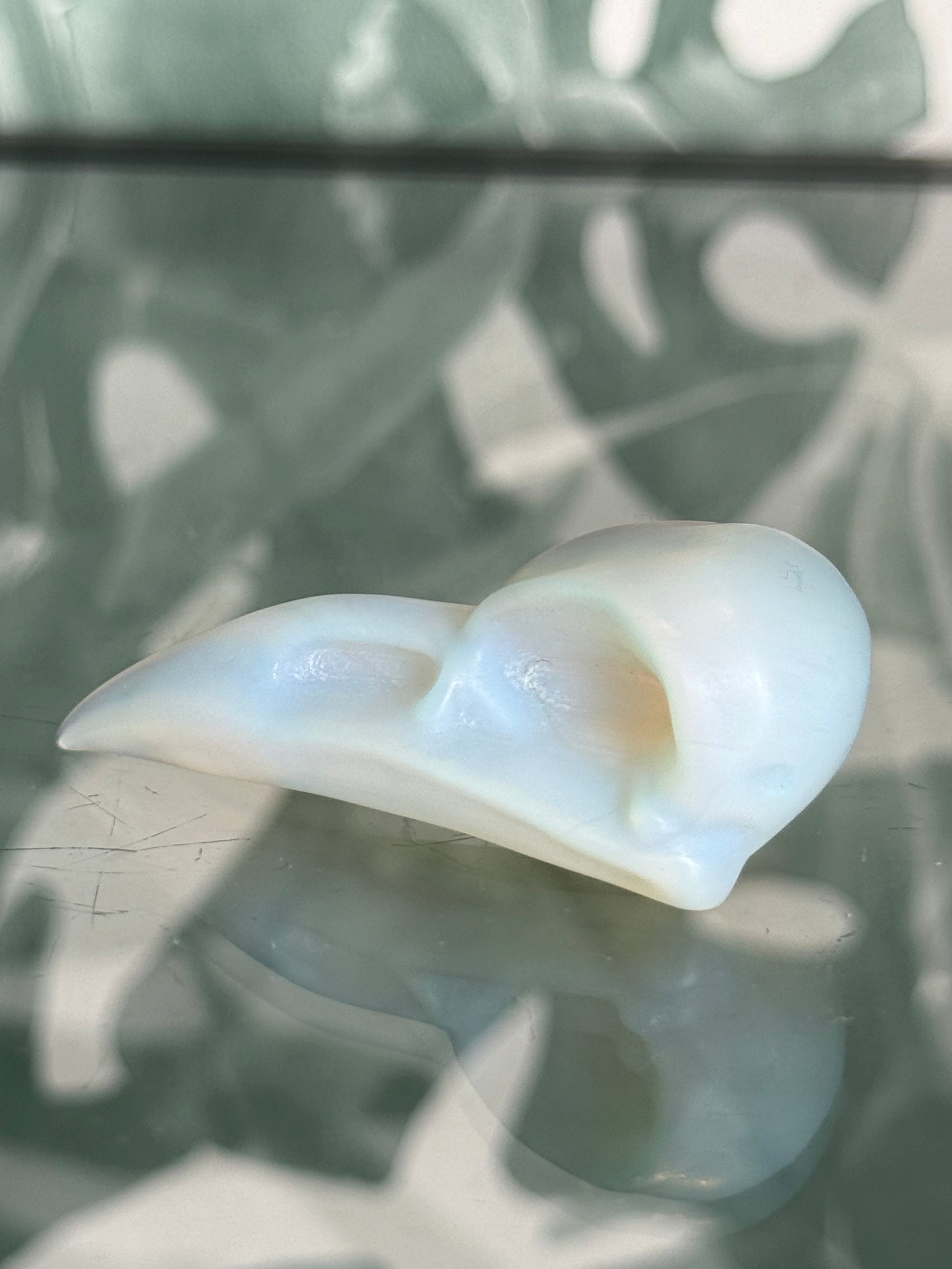 Deze bijzondere raven skull is gemaakt van opaliet en heeft een zachte melkachtige glans met subtiele blauwe en warme gloed. De raaf staat symbool voor wijsheid, mysterie en het zien van verborgen waarheden, terwijl de schedel transformatie en nieuwe inzichten vertegenwoordigt. Samen vormen ze een krachtig spiritueel object.