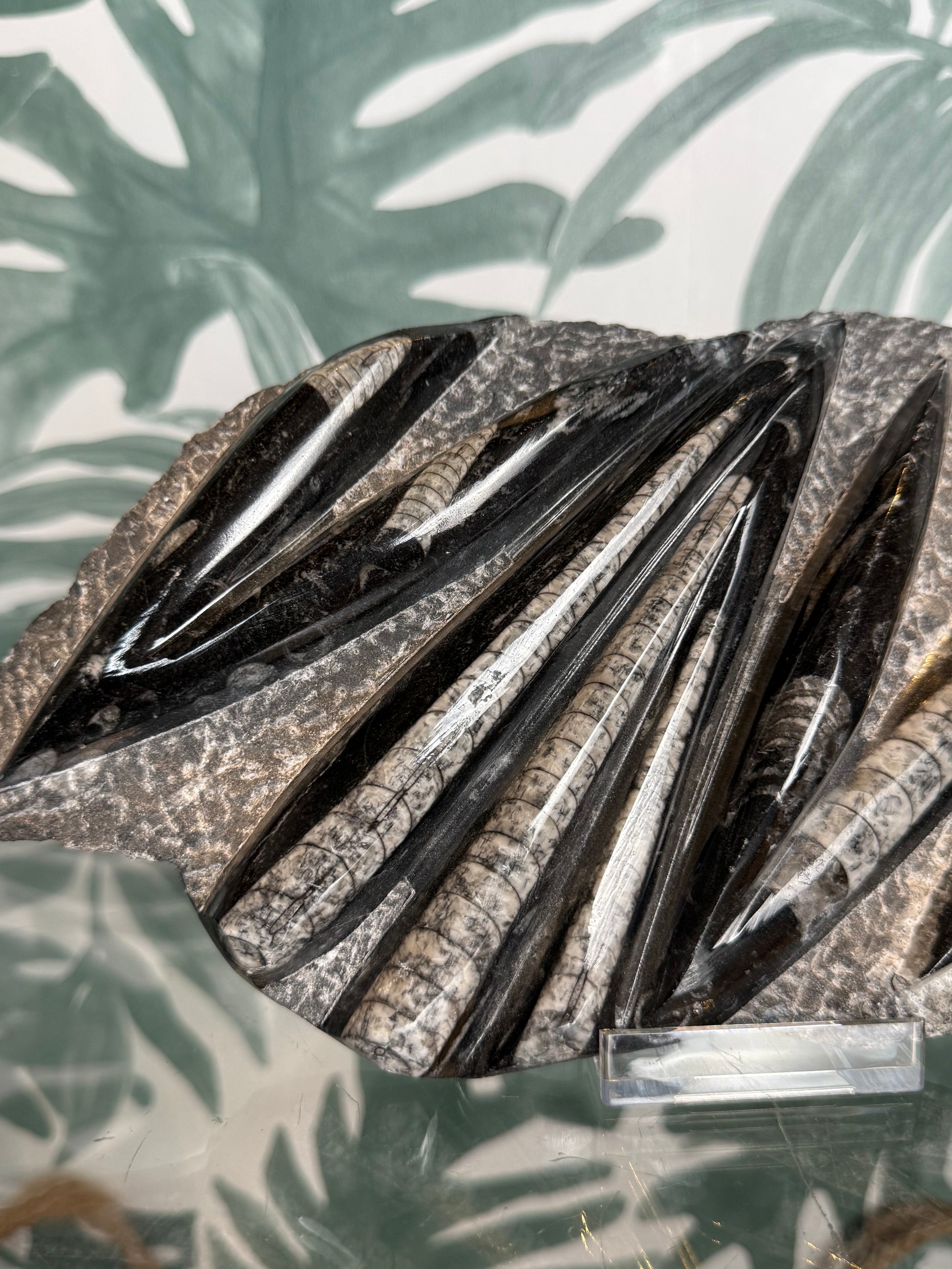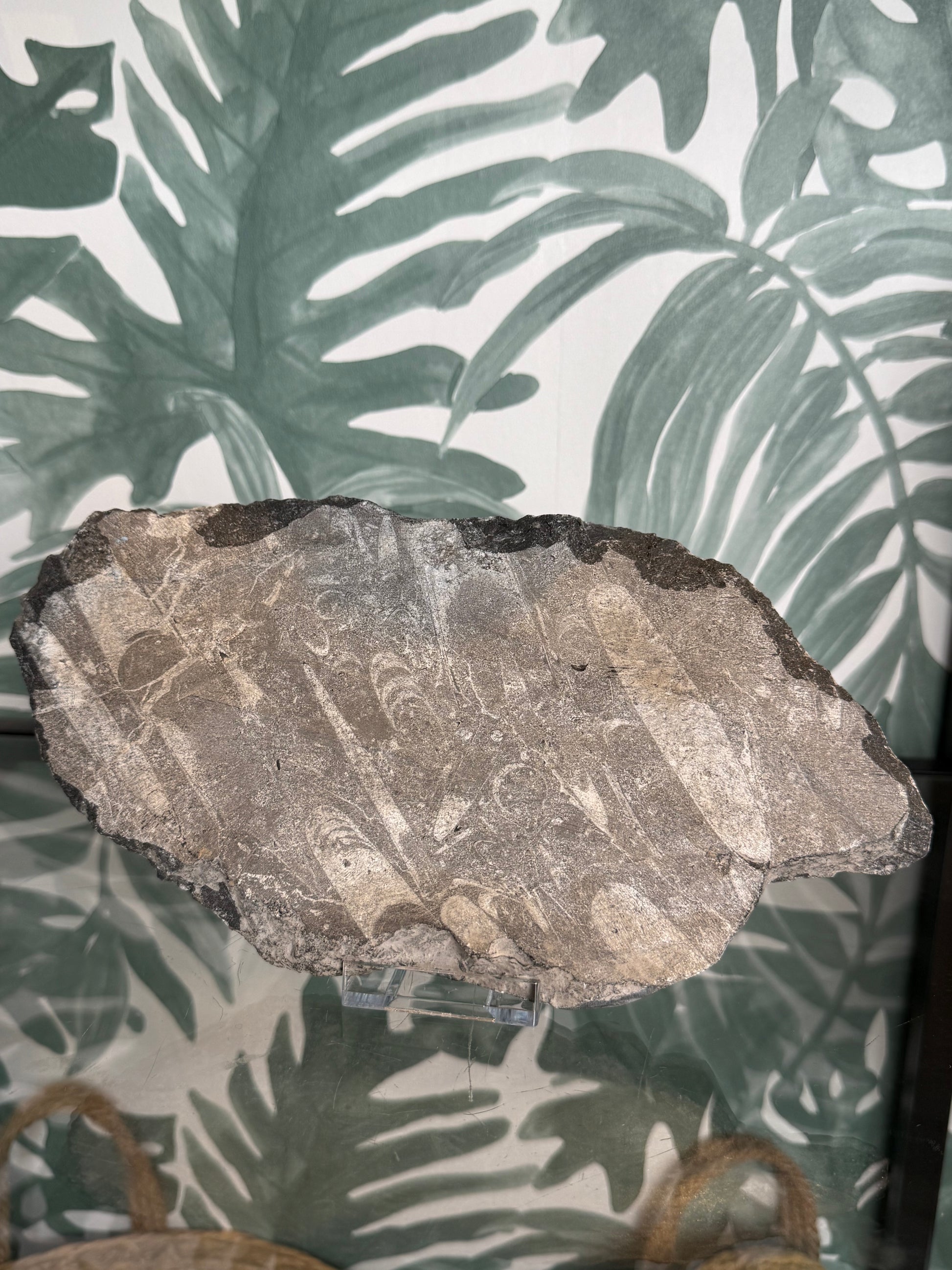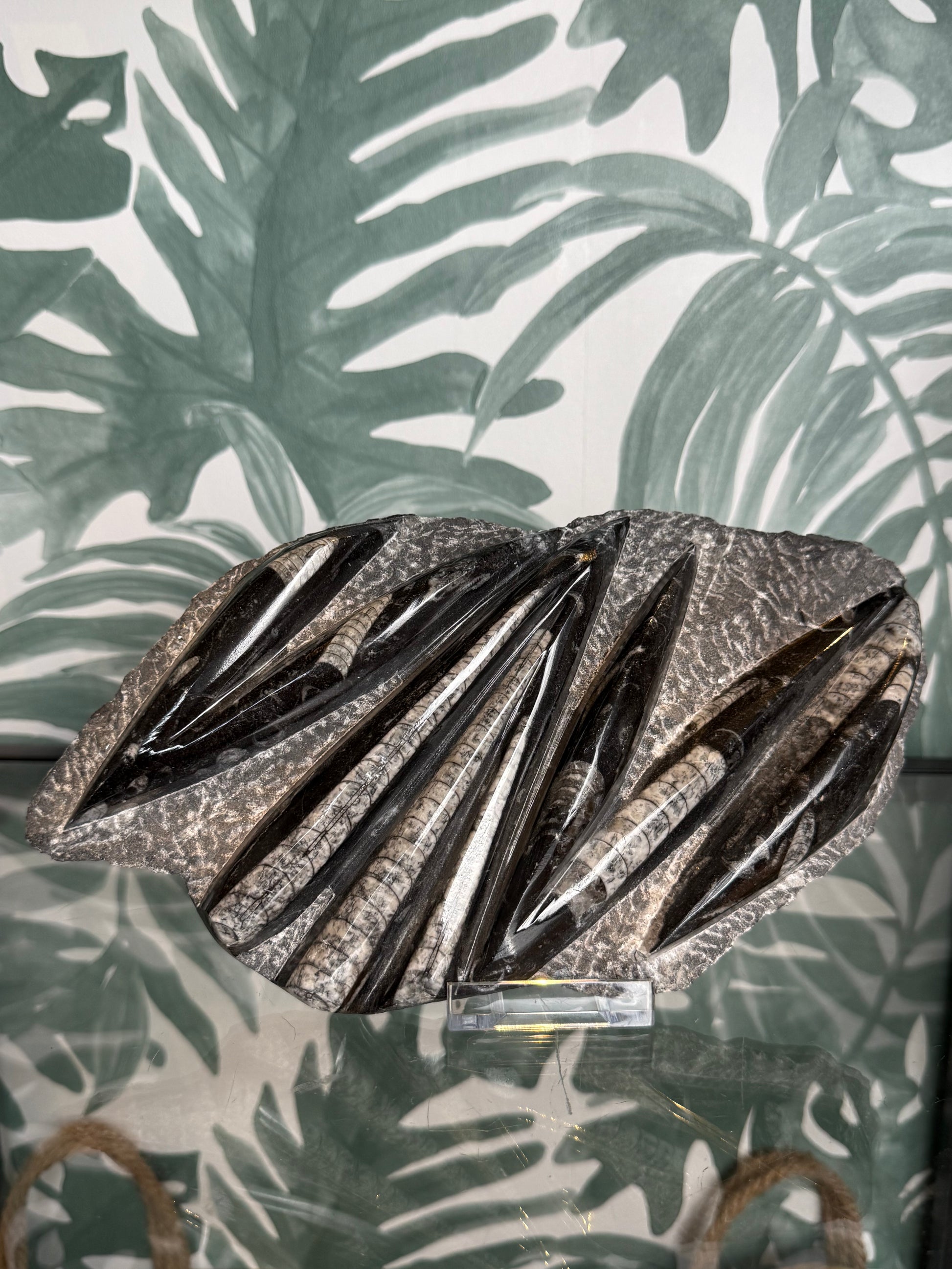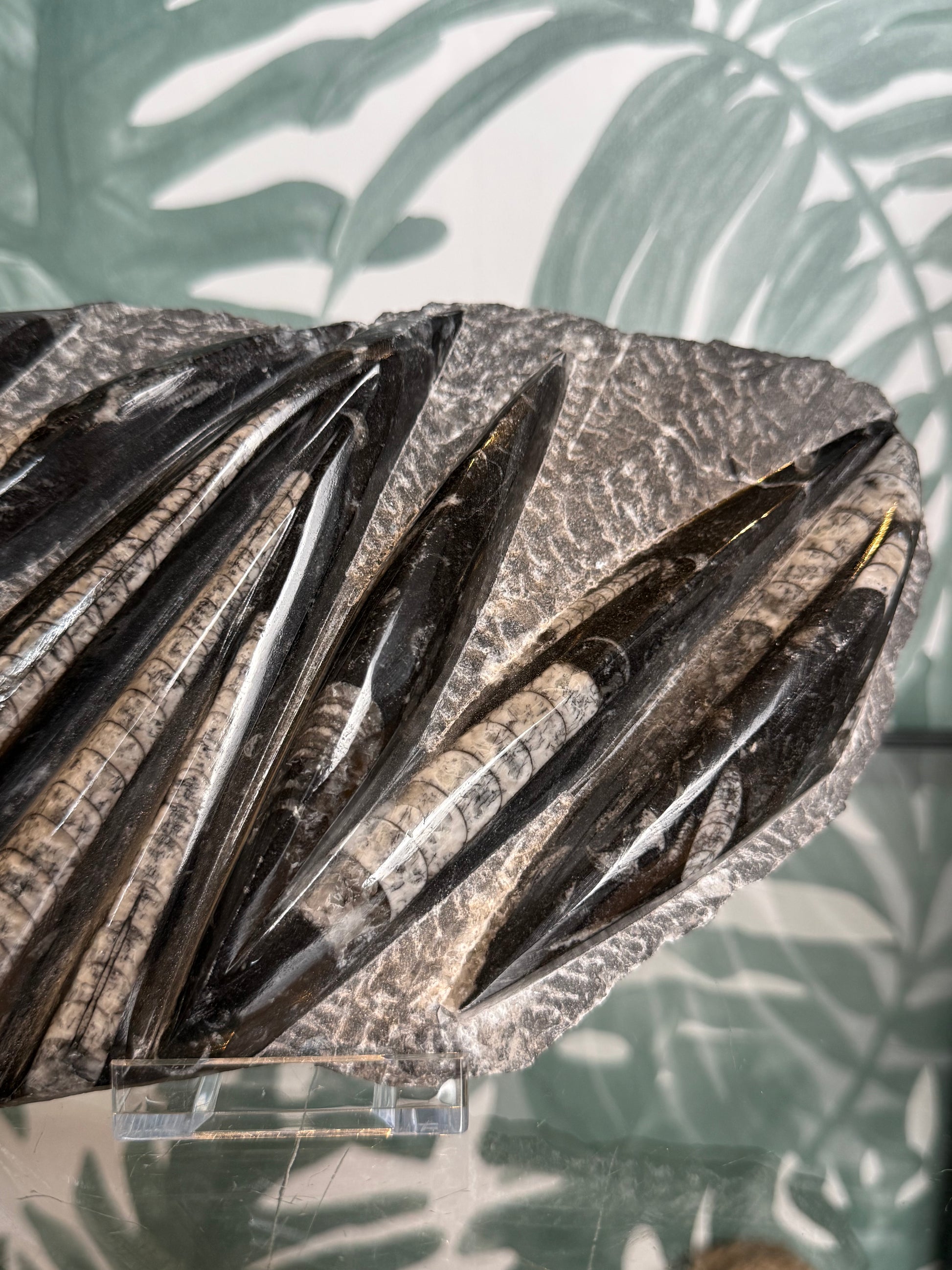 Dit indrukwekkende Orthoceras fossiel is een krachtig en decoratief pronkstuk. De langwerpige fossielen zijn prachtig zichtbaar gepolijst in de steen en vormen samen een dynamisch en bijna grafisch patroon. Een bijzonder stuk dat meteen de aandacht trekt en perfect past in een natuurlijk, aards interieur.