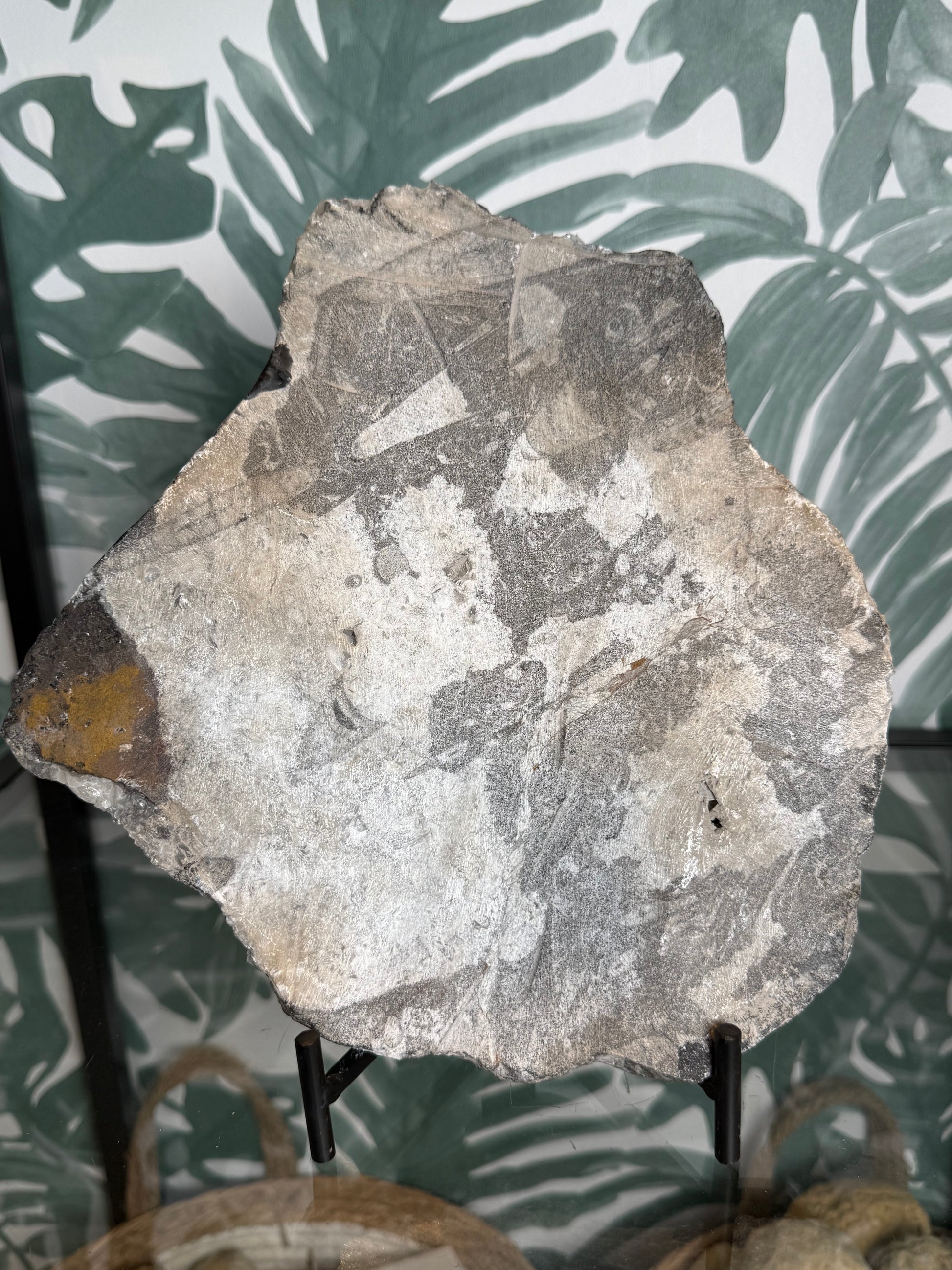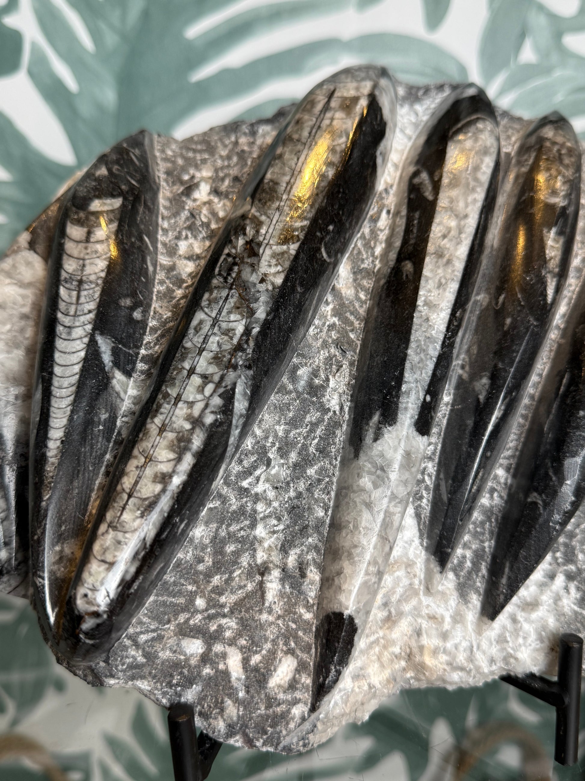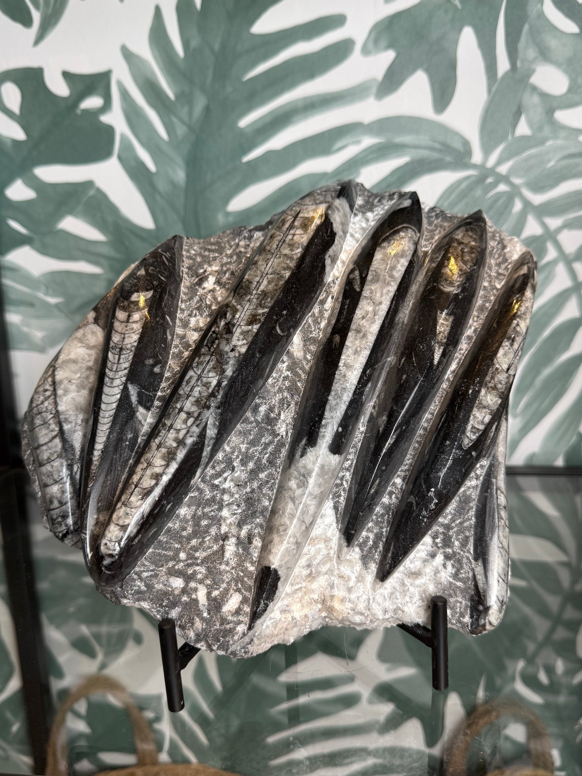 Dit indrukwekkende Orthoceras fossiel is een krachtig en decoratief pronkstuk. De langwerpige fossielen zijn prachtig zichtbaar gepolijst in de steen en vormen samen een dynamisch en bijna grafisch patroon. Een bijzonder stuk dat meteen de aandacht trekt en perfect past in een natuurlijk, aards interieur.
