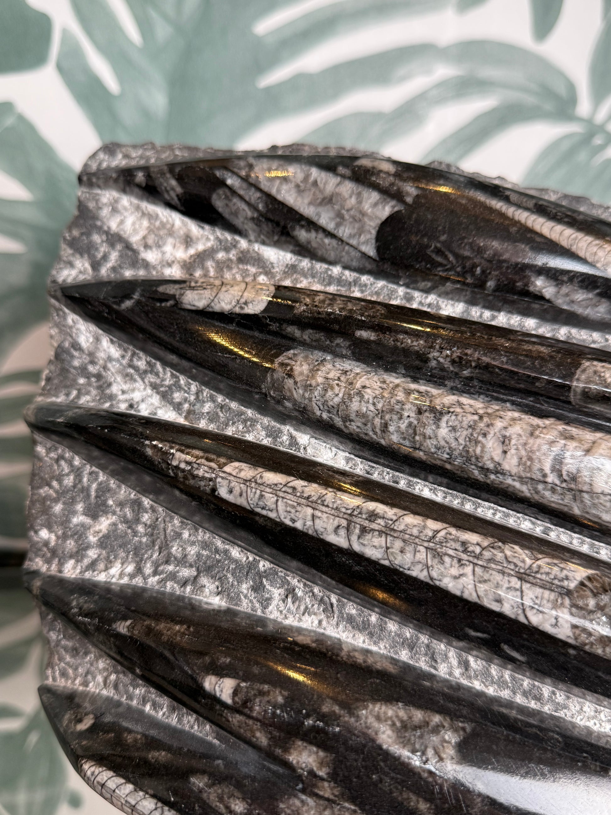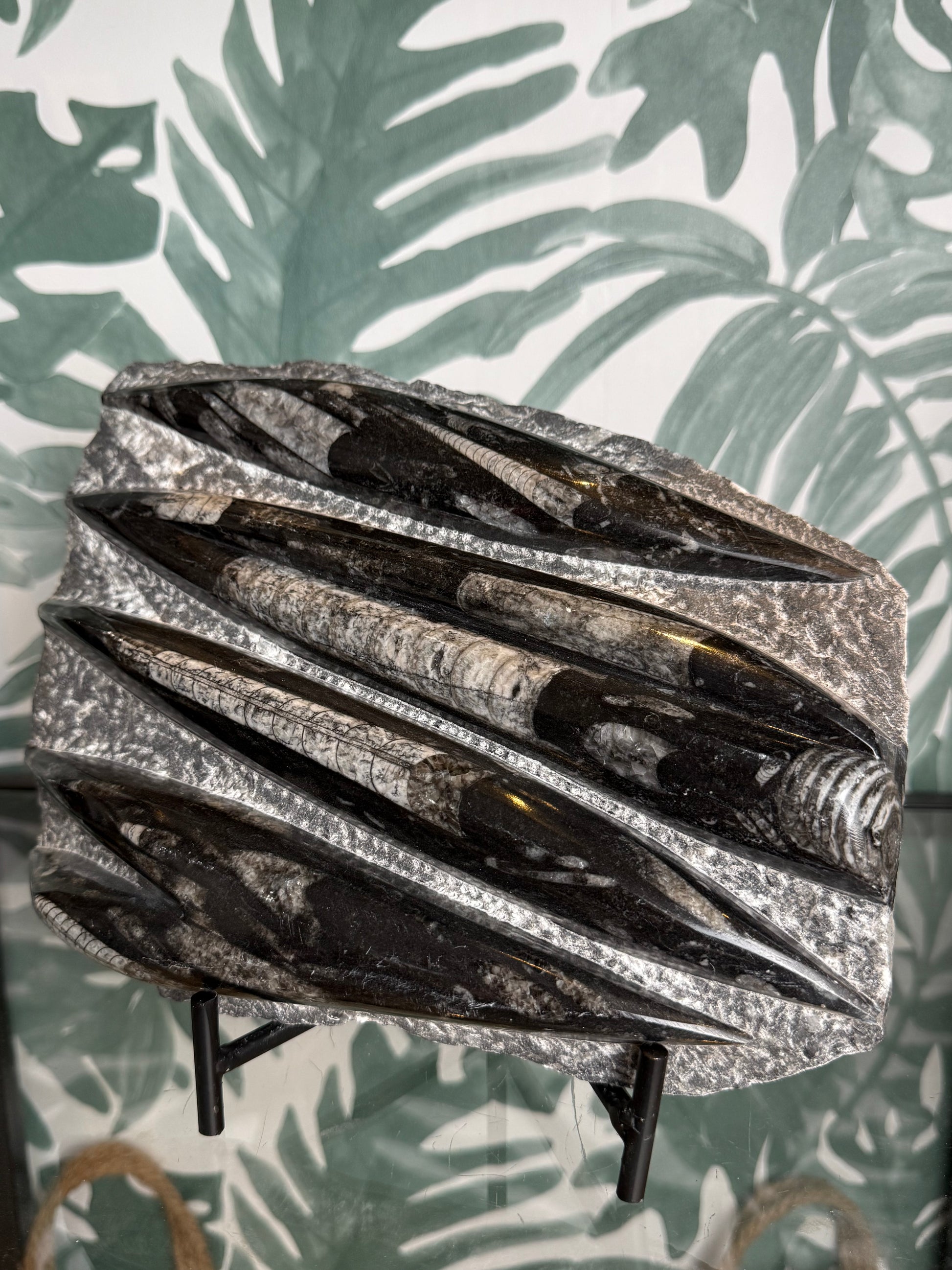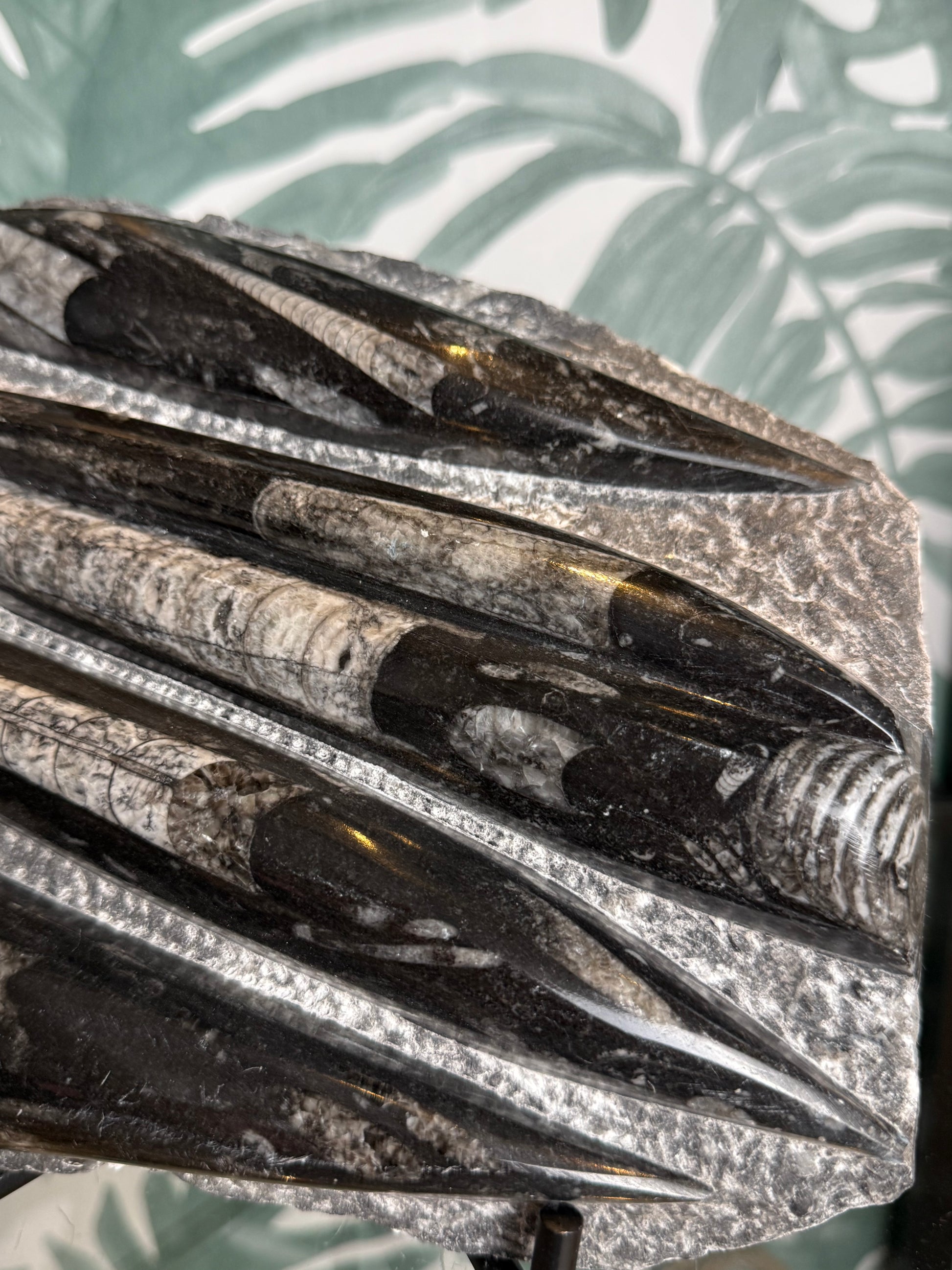 Dit indrukwekkende Orthoceras fossiel is een krachtig en decoratief pronkstuk. De langwerpige fossielen zijn prachtig zichtbaar gepolijst in de steen en vormen samen een dynamisch en bijna grafisch patroon. Een bijzonder stuk dat meteen de aandacht trekt en perfect past in een natuurlijk, aards interieur.