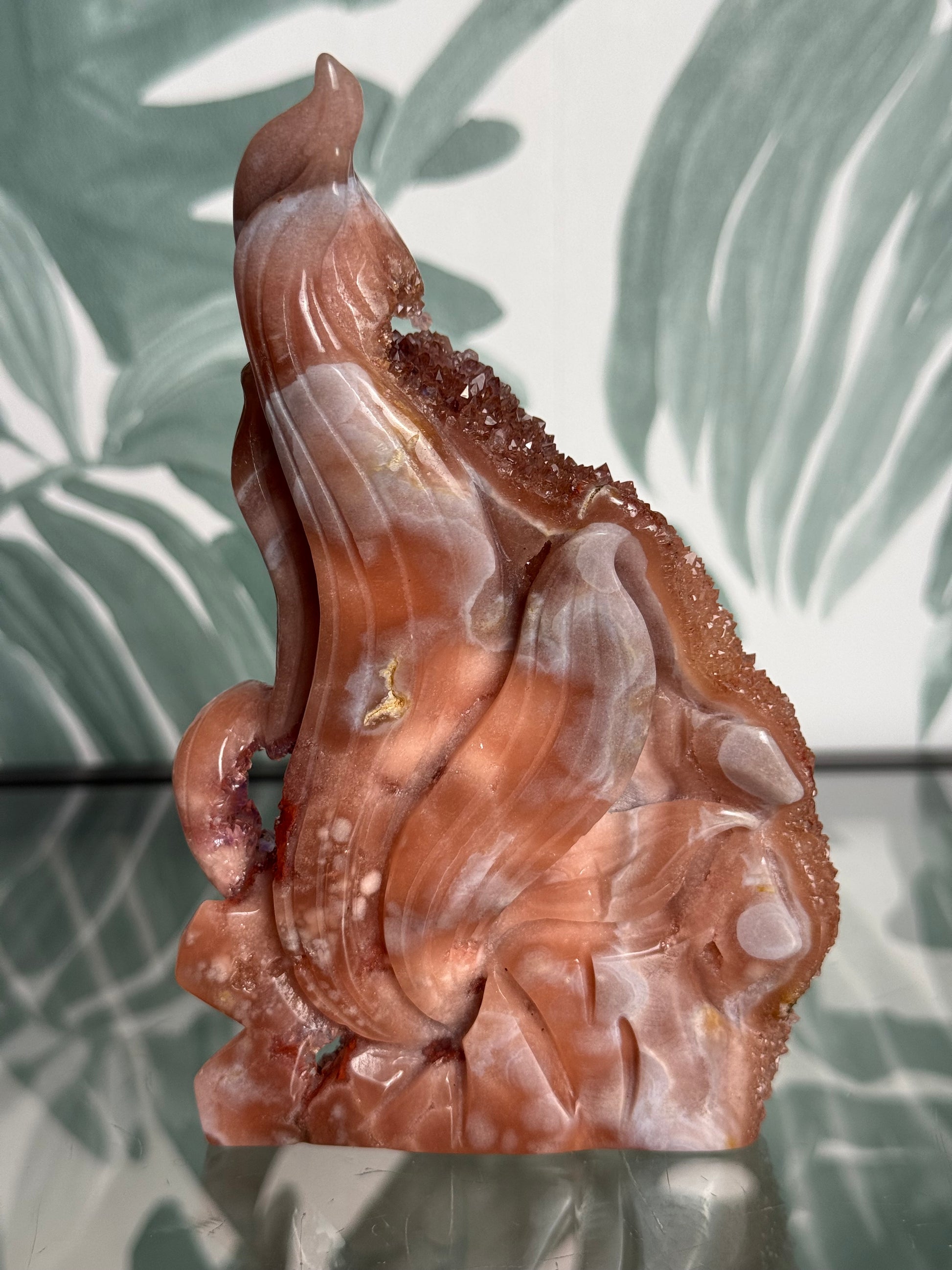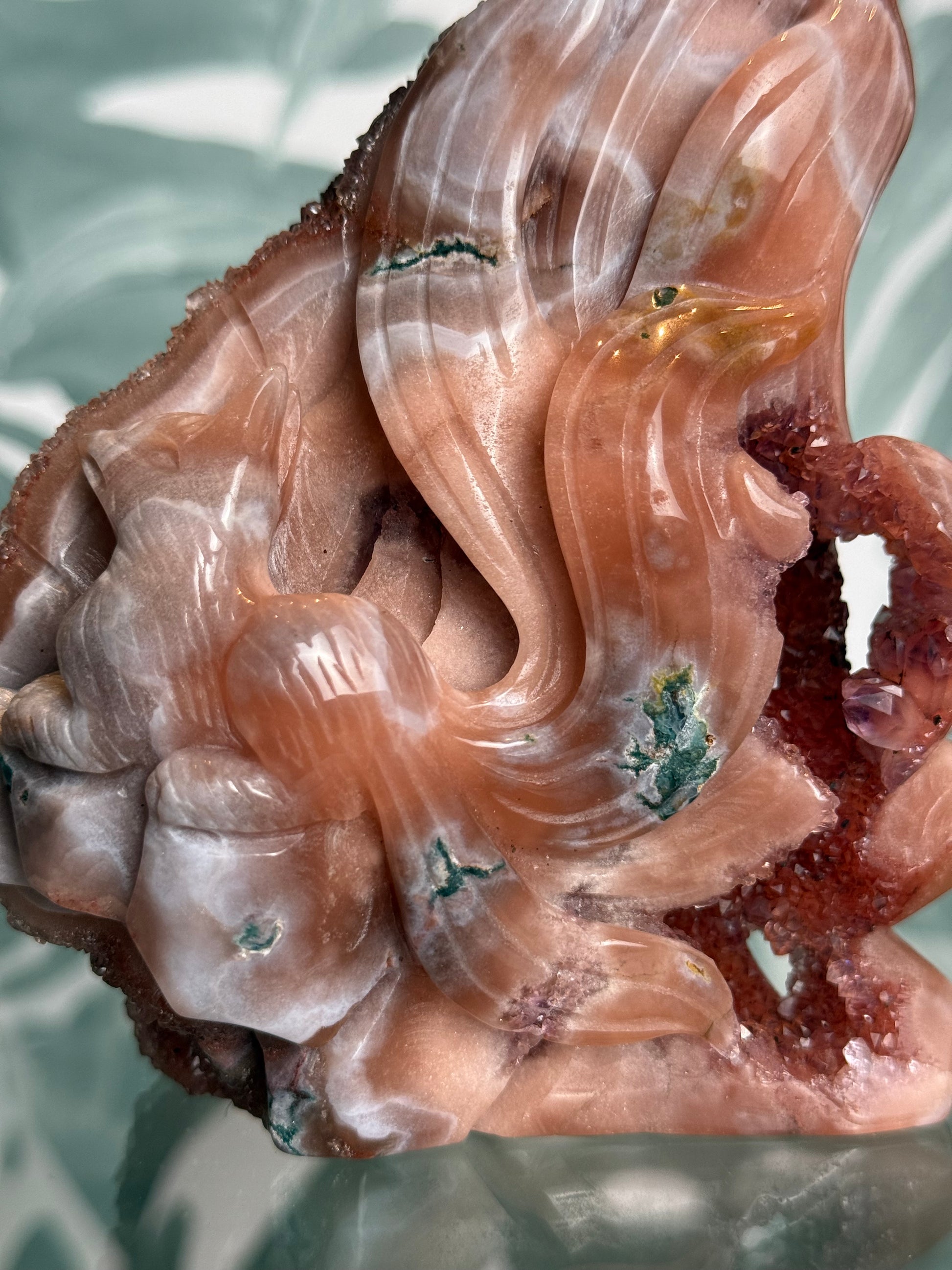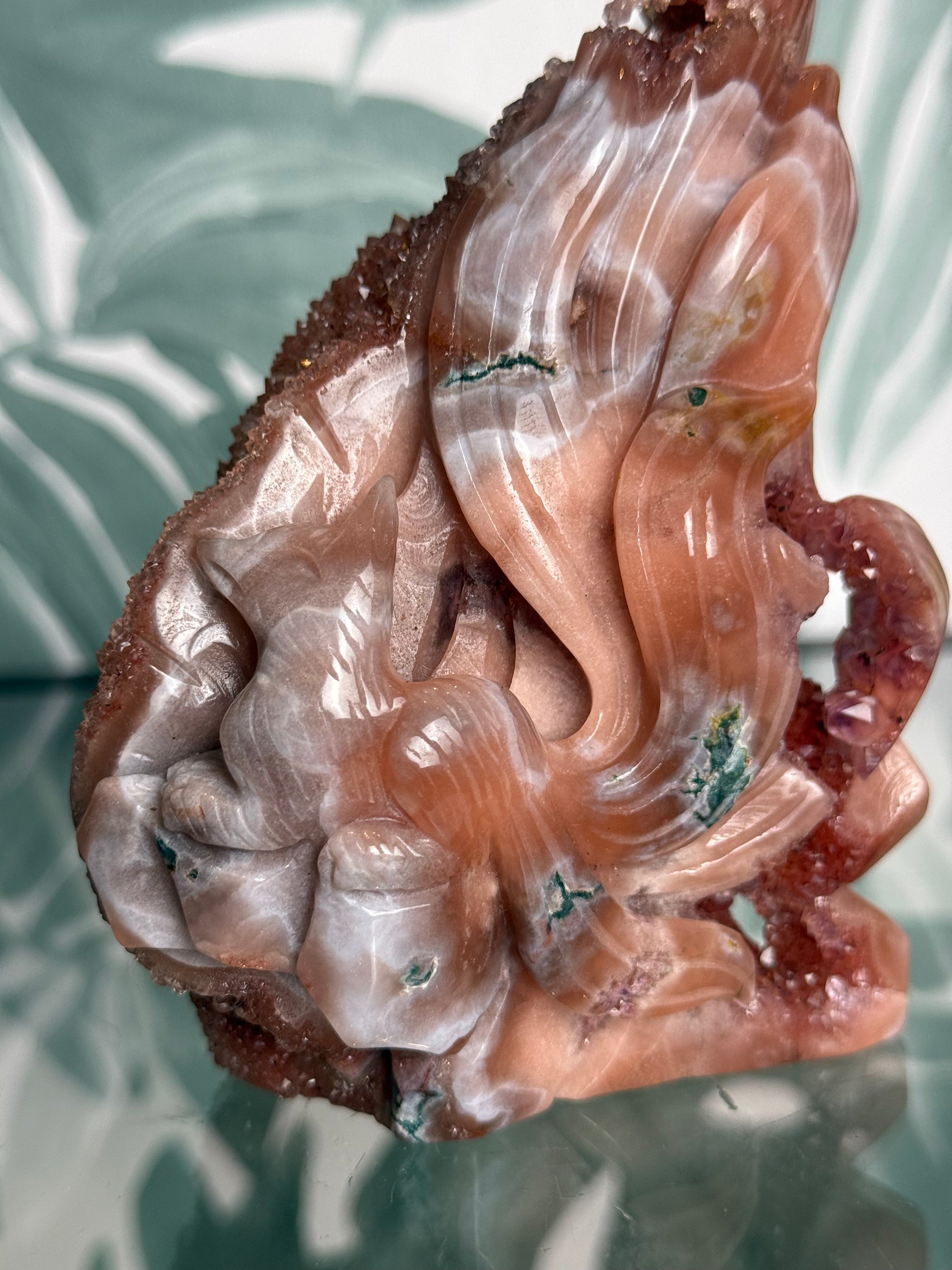 Deze indrukwekkende Nine-Tailed Fox carving is gesneden uit Roze Amethist met Agaat en straalt een krachtige, beschermende energie uit. De sierlijk omhoog krullende negen staarten vormen een vloeiend geheel van warme perzik- en rozetinten, terwijl de achterzijde is verrijkt met een rijke laag fonkelende roze amethist druzy.