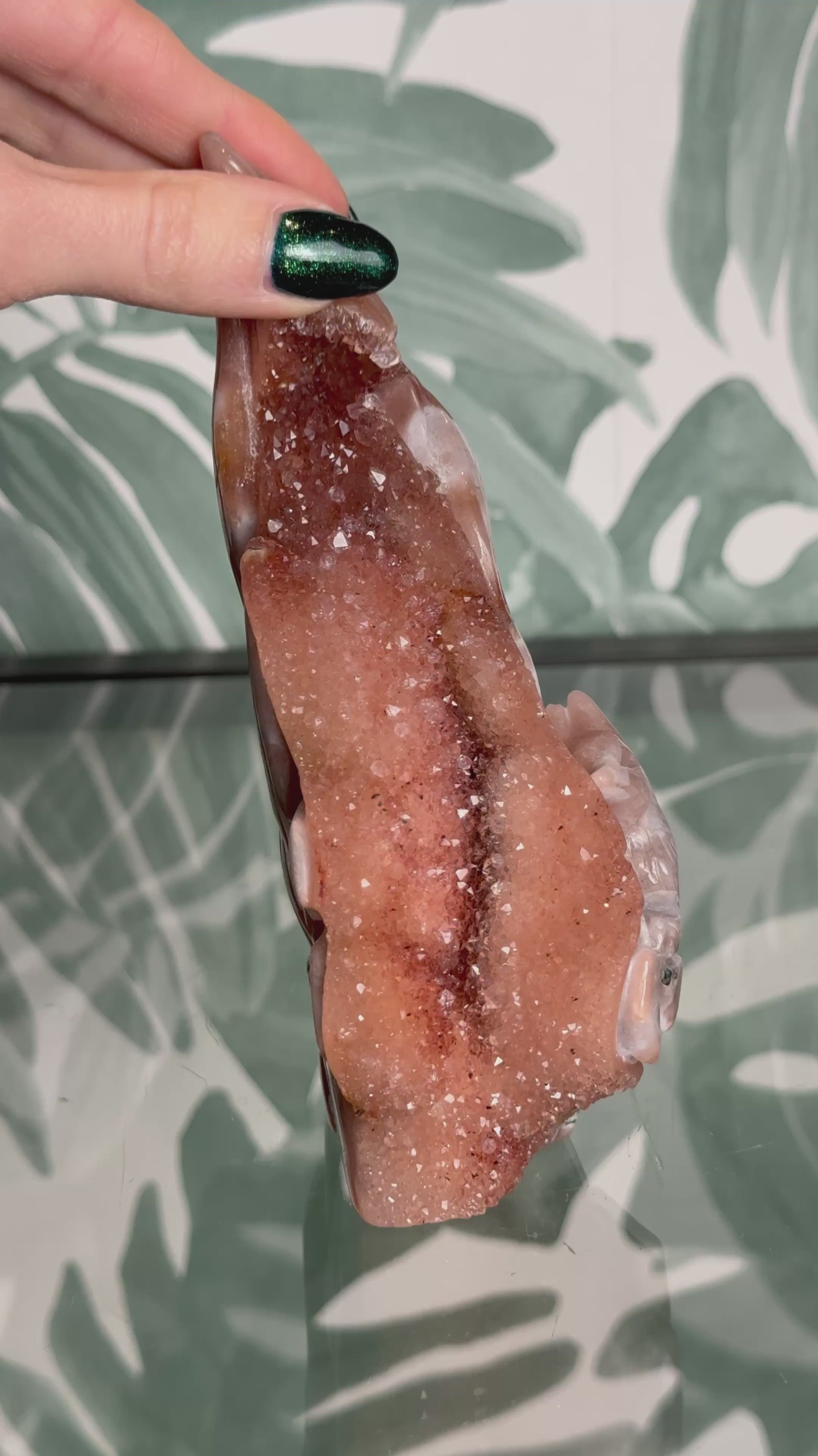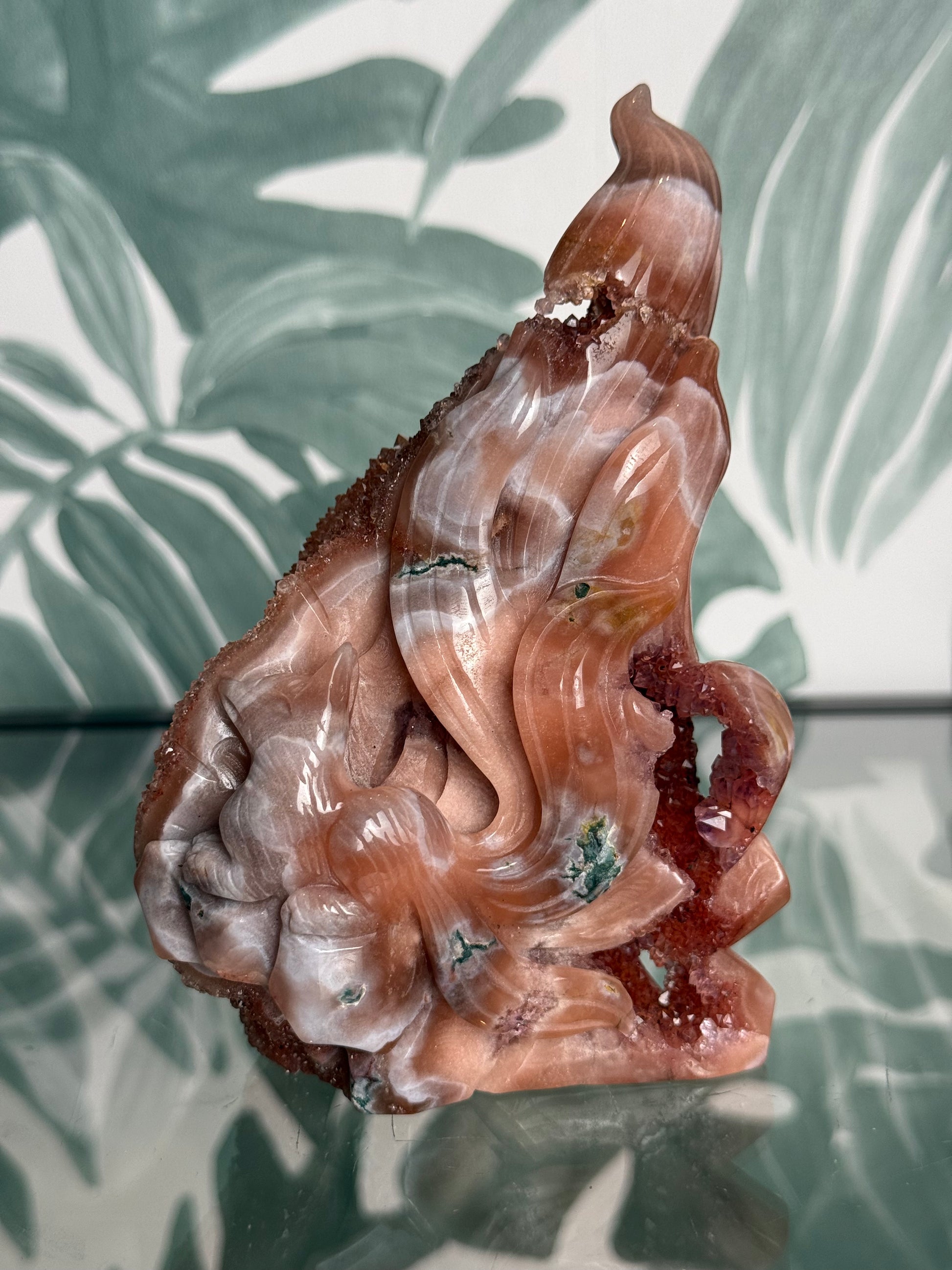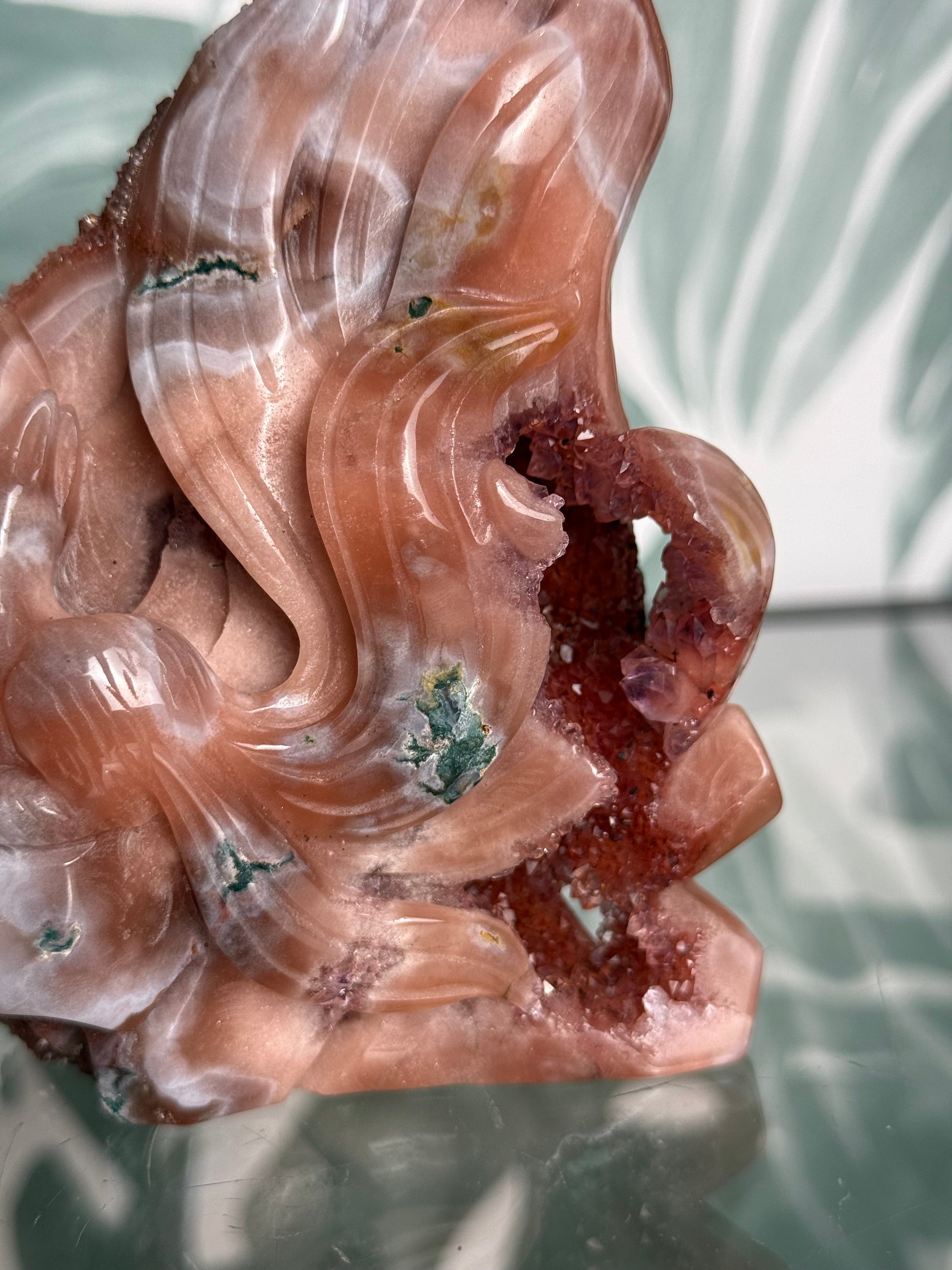 Deze indrukwekkende Nine-Tailed Fox carving is gesneden uit Roze Amethist met Agaat en straalt een krachtige, beschermende energie uit. De sierlijk omhoog krullende negen staarten vormen een vloeiend geheel van warme perzik- en rozetinten, terwijl de achterzijde is verrijkt met een rijke laag fonkelende roze amethist druzy.