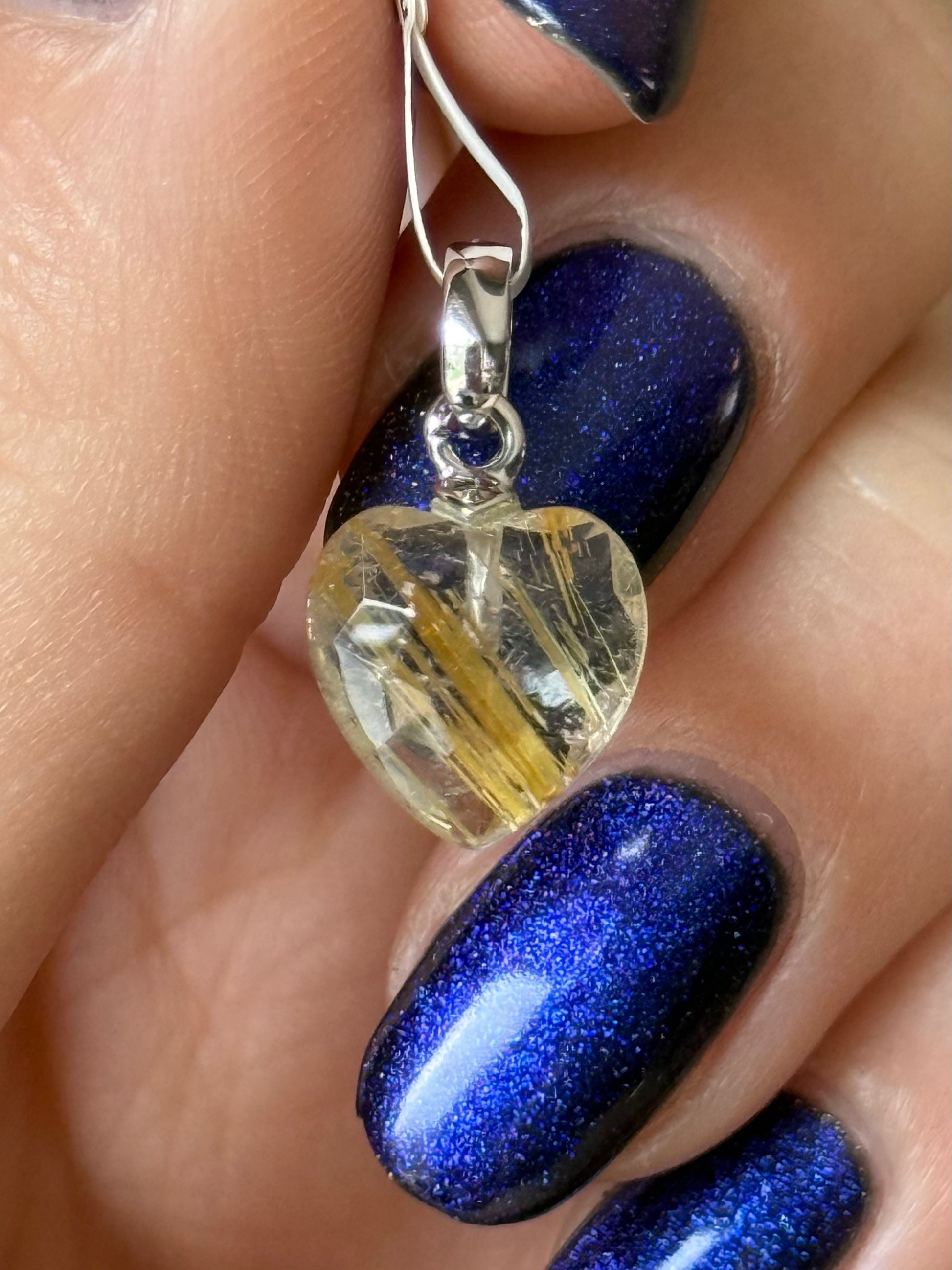 Deze facetgeslepen hart hanger (10 mm) met 925 sterling zilver bevat fijne goudkleurige naaldjes die symbool staan voor hoop, energie en inspiratie.