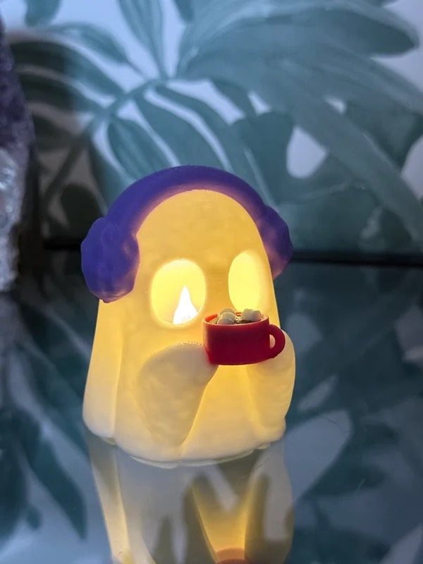Spook met oorwarmers en choco waxinelichthouder