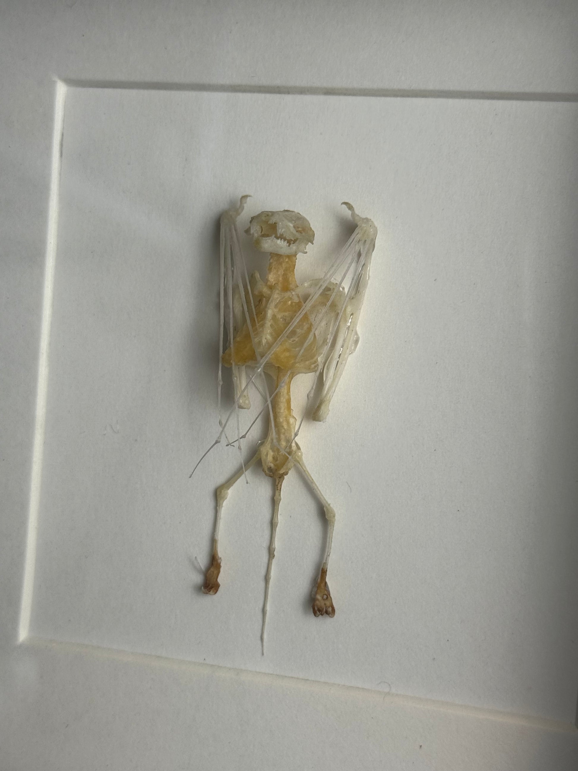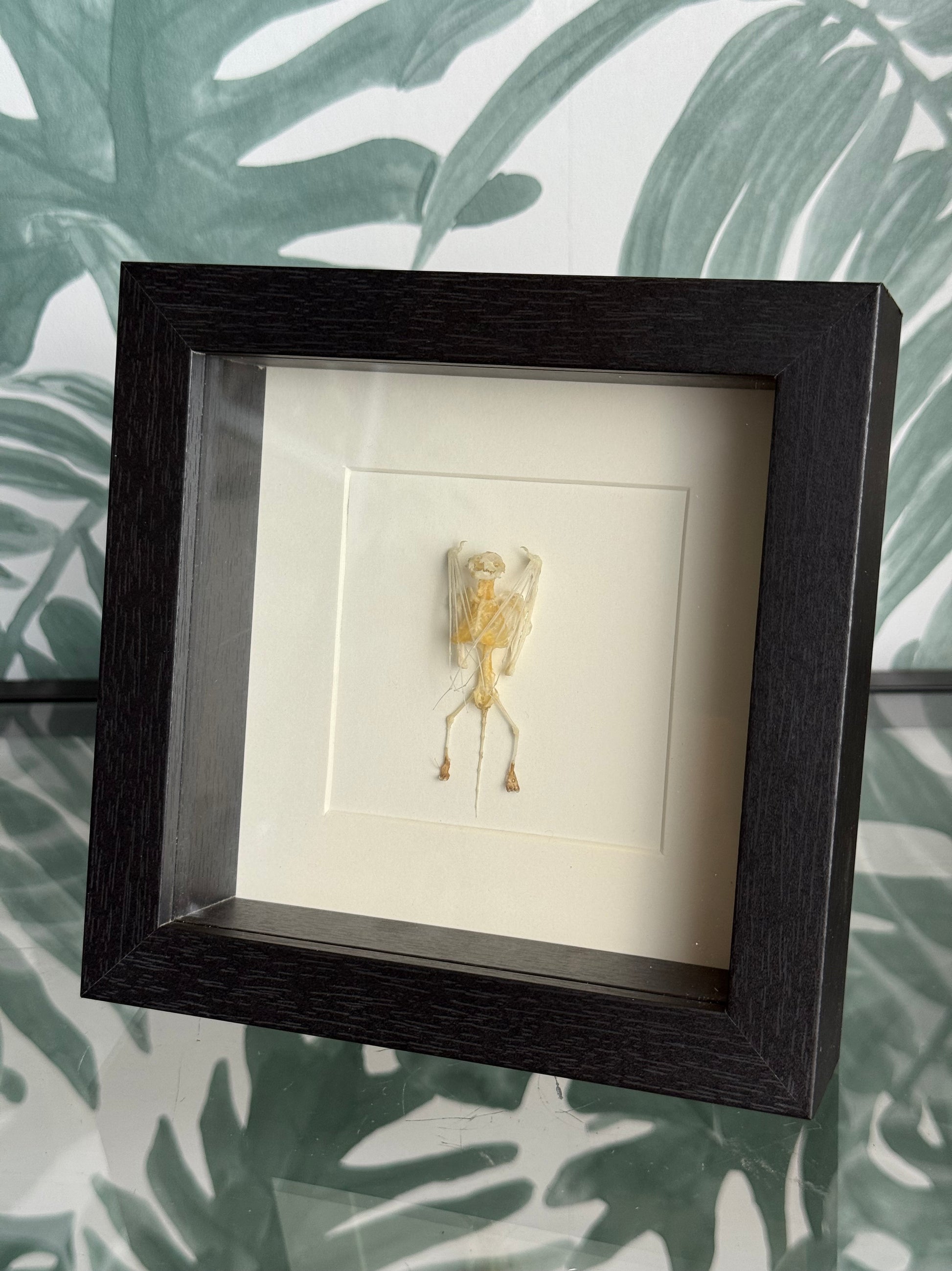 Kleine vleermuis in zwarte lijst, netjes geprepareerd en voorzien van een lichte passe-partout. De neutrale achtergrond en het strakke kader laten het dier goed tot zijn recht komen.